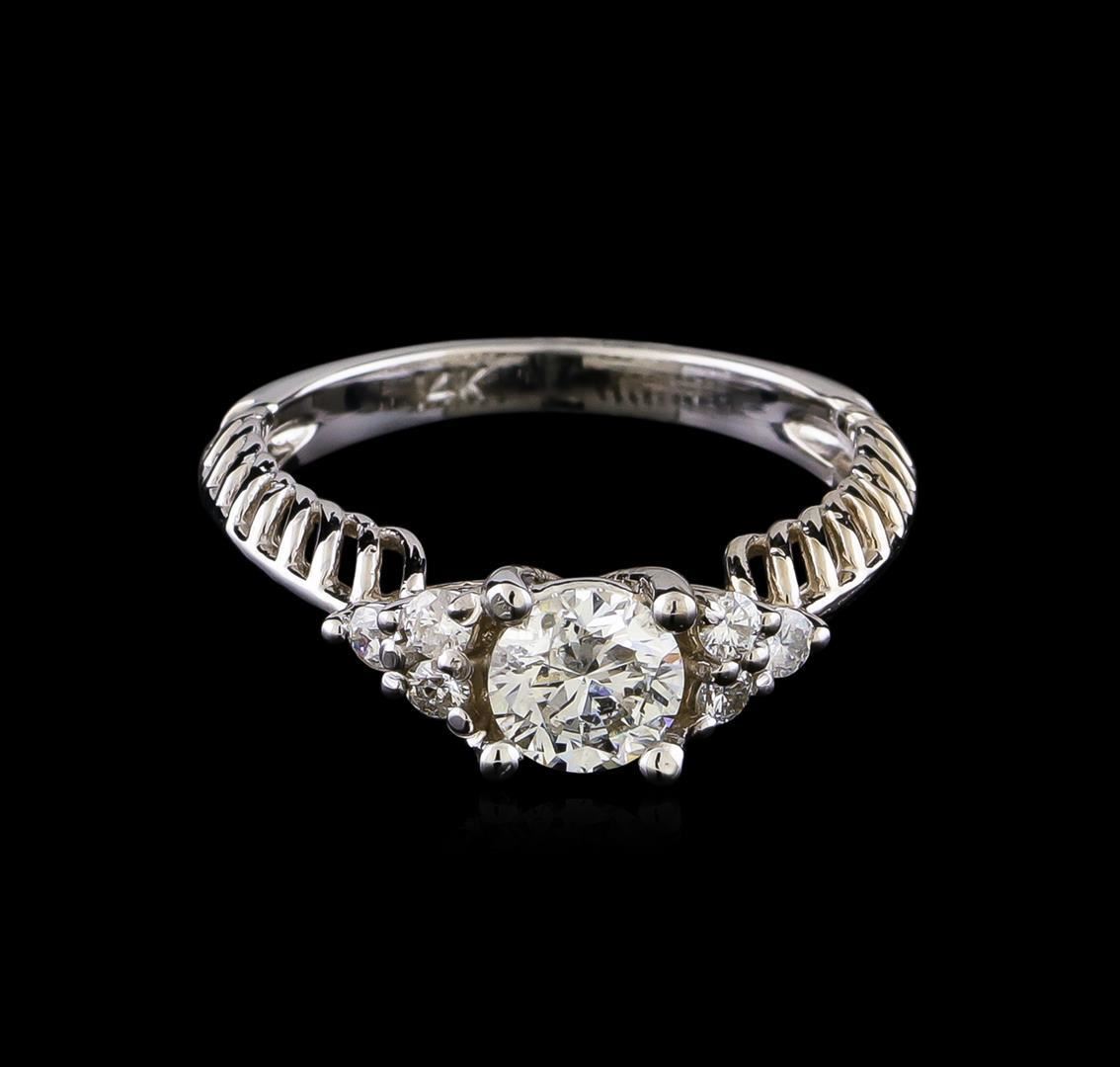 One electronically tested 14KT white gold lady's cast wedding ring with a bright polish finish. The featured lady's ring has an open scalloped shank measuring 2.30 millimeters in width. Identified with markings of "14K". Condition is new, good workmanship. Containing: One prong set round brilliant cut diamond, measuring 5.66 - 5.65 x 3.60mm (depth est.) approximate weight of 0.70ct. Graded in the setting. Clarity: I-1. Color: H - I. Cut Good Six prong set round brilliant cut diamonds, measuring 2.10 - 2.00 x 1.27mm (depth est.) approximate total weight of 6 Stones = 0.20ct. Graded in the setting. Clarity: SI-2 to I-1. Color: H - I. Cut Good. Total Weight of Diamonds 0.90ct. Total Weight of Ring 3.30gm. GAS Appraised.