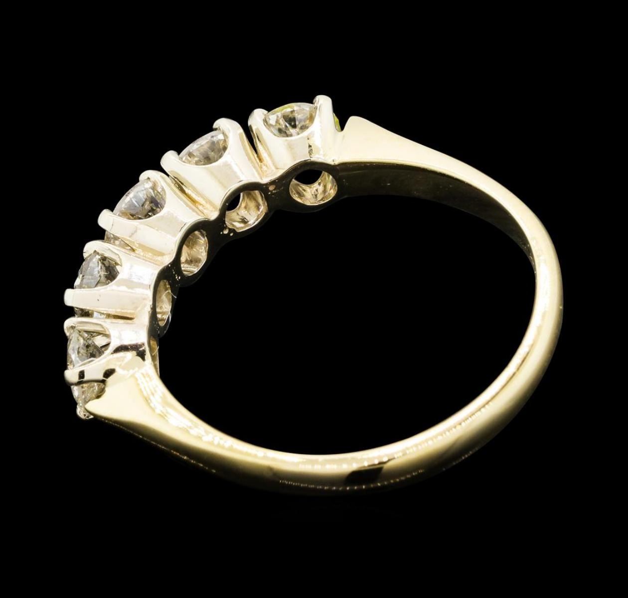 One electronically tested 14KT yellow gold lady's cast 5-stone wedding ring with a straight line with a bright polish finish. The featured lady's ring has a shank measuring 2.10 millimeters wide. Identified with markings of '14K'. Condition is new, good workmanship. Containing: Five prong set round brilliant cut diamonds, measuring 3.90 - 3.50 x 2.15mm (depth est.) approximate total weight of 5 Stones = 0.90ct. Graded in the setting. Color I - K Clarity SI-2 to I-1 Cut Good. Total Weight of Diamonds 0.90ct.. Total Weight of Ring 2.40gm GAS Appraised at $1,970.00.