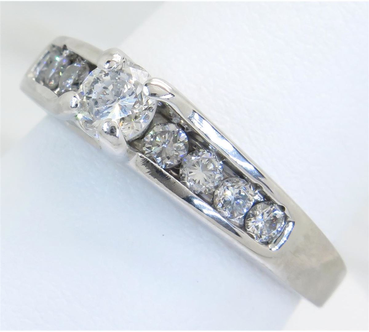 One tested platinum diamond ring. Containing: One Round Brilliant Cut Diamond. Approximate Size: .40CT, Clarity: I1, Color: G-H. 9 Round Brilliant Cut Diamonds. Approximate total diamond weight: .90CTW. All diamonds are graded in the mounting unless otherwise stated. Weight of ring: 8.2 grams, Size: 8.5.