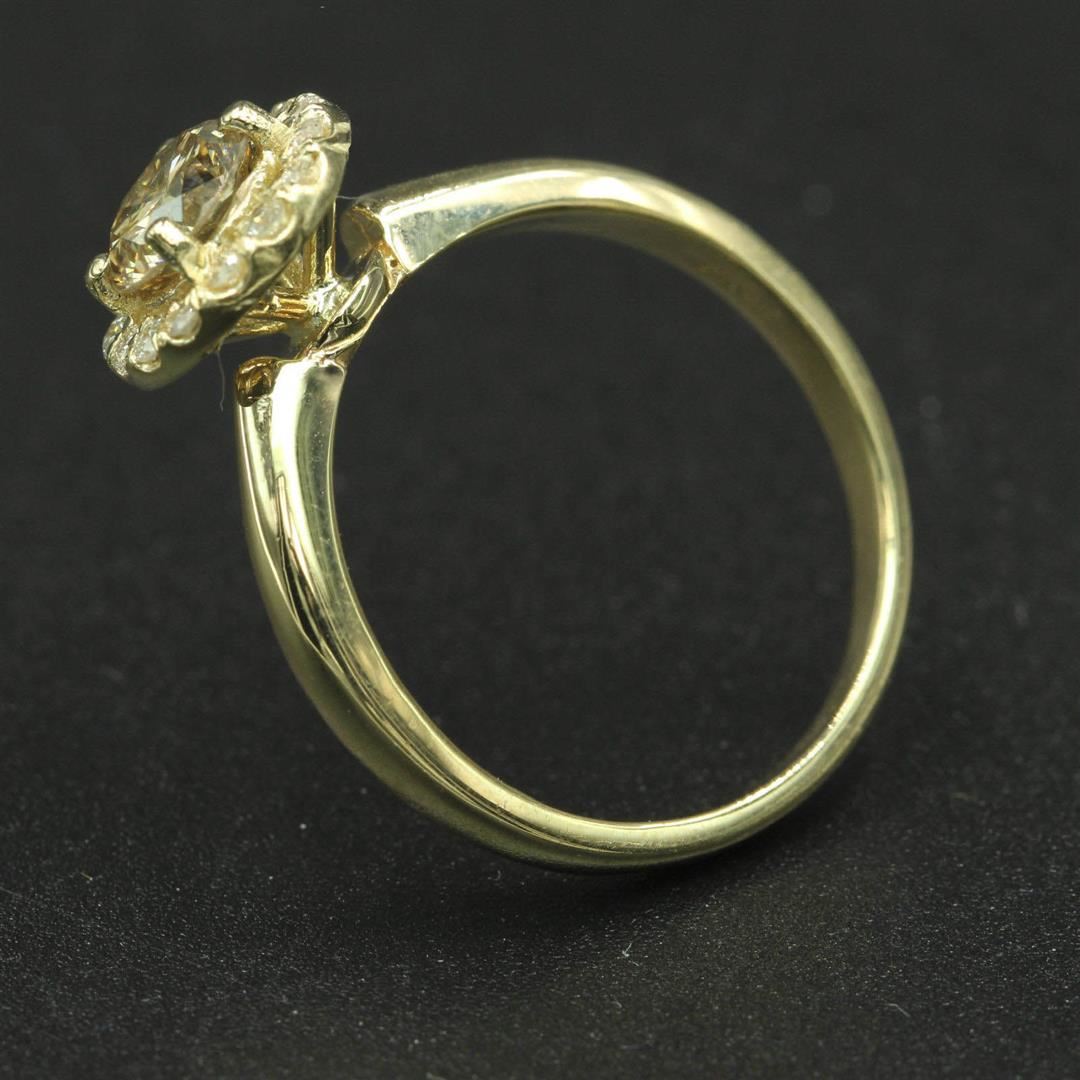 One lady's ring featuring: 14KT yellow gold weighing 3.30 grams containing one center diamond weighing 0.75ct and side diamonds weighing 0.15ctw. The center diamond is round brilliant cut and unenhanced, with VS1 clarity, fancy brown color and excellent c