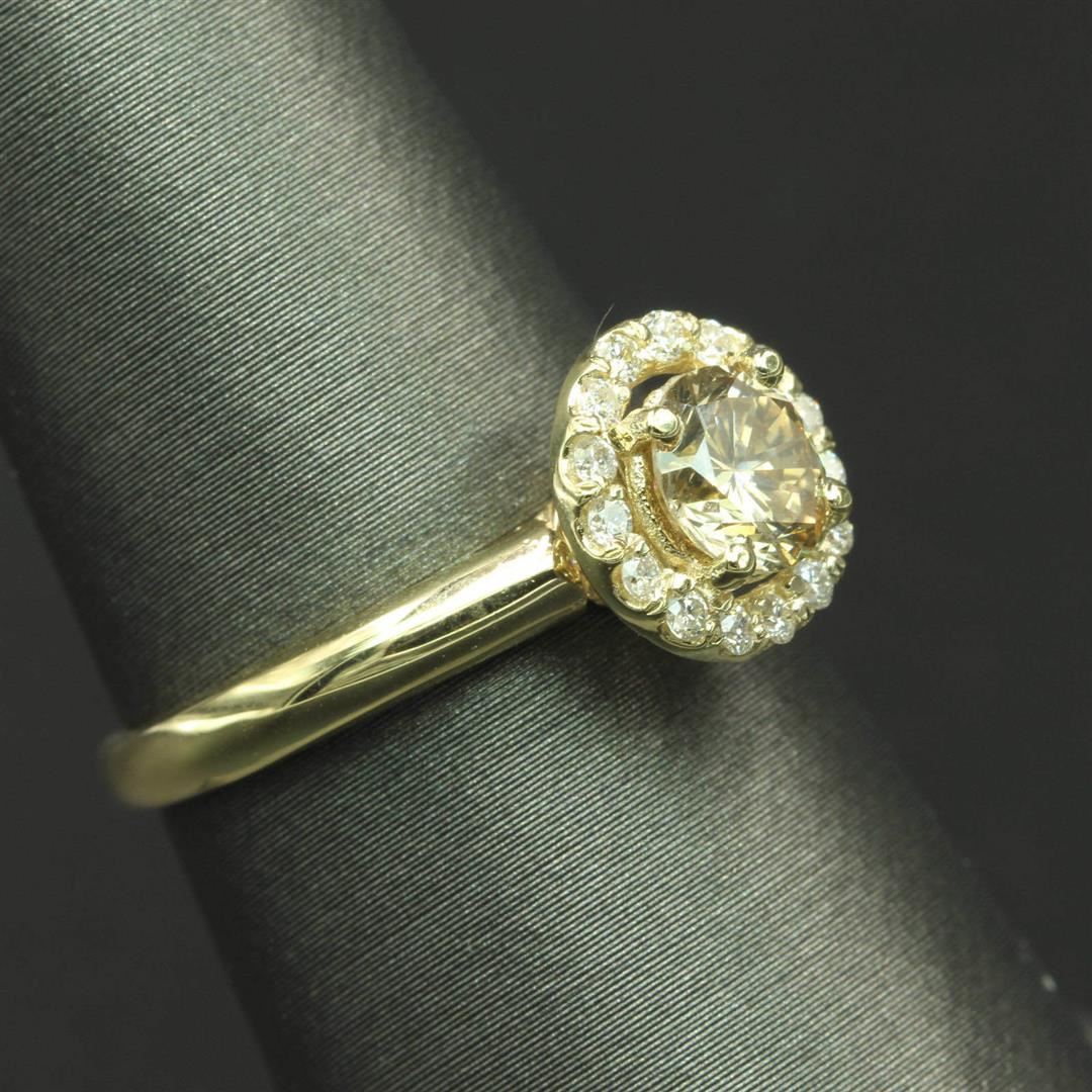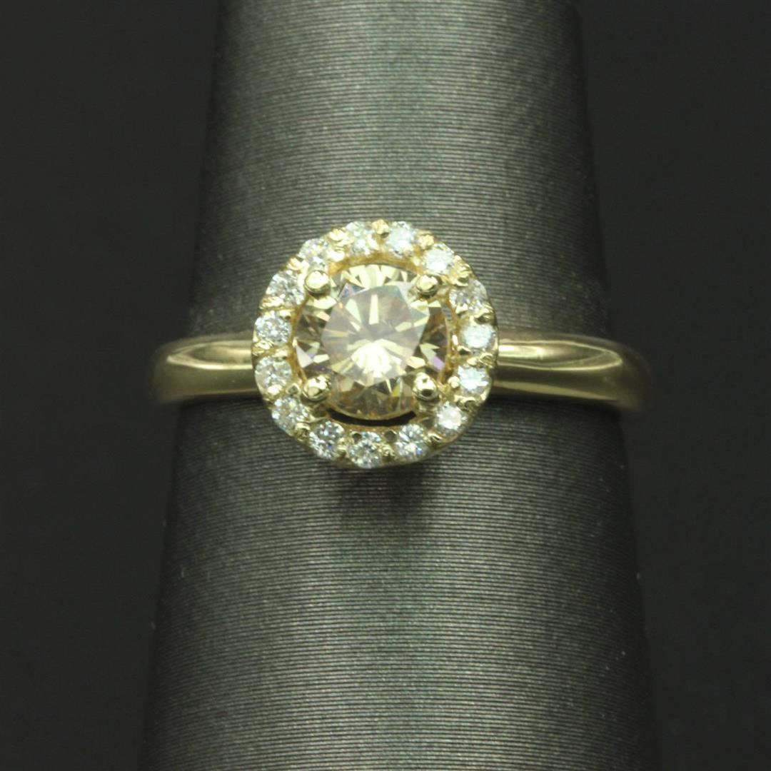 One lady's ring featuring: 14KT yellow gold weighing 3.30 grams containing one center diamond weighing 0.75ct and side diamonds weighing 0.15ctw. The center diamond is round brilliant cut and unenhanced, with VS1 clarity, fancy brown color and excellent c