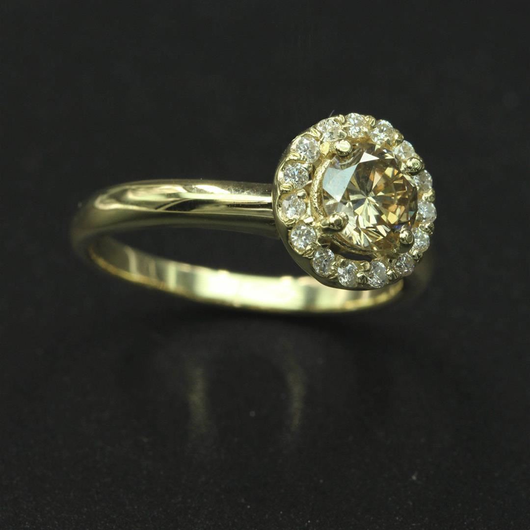 One lady's ring featuring: 14KT yellow gold weighing 3.30 grams containing one center diamond weighing 0.75ct and side diamonds weighing 0.15ctw. The center diamond is round brilliant cut and unenhanced, with VS1 clarity, fancy brown color and excellent c