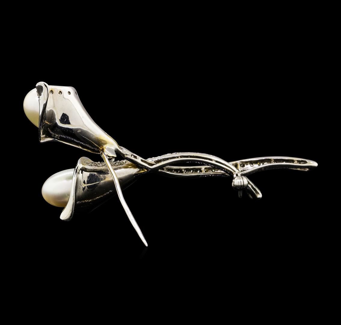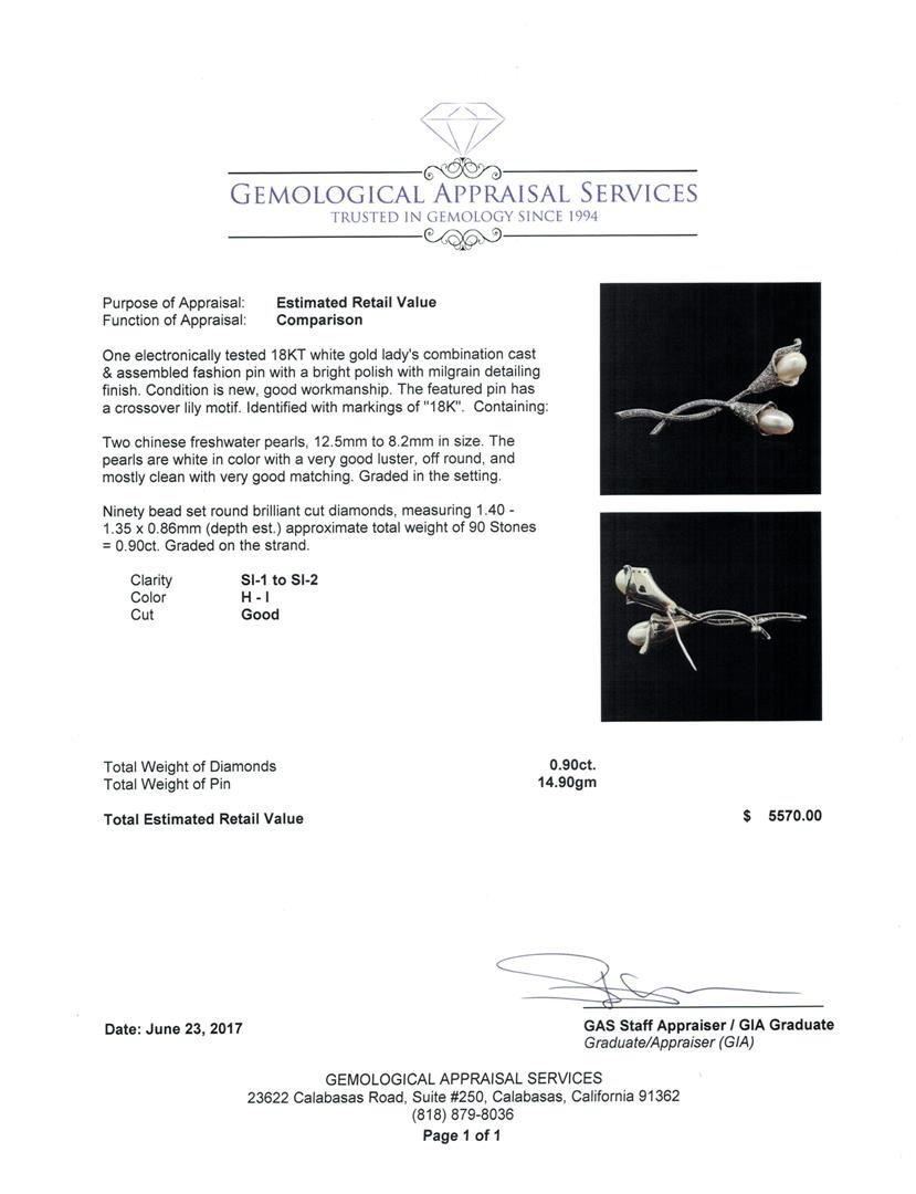 One electronically tested 18KT white gold lady's combination cast & assembled fashion pin with a bright polish with milgrain detailing finish. The featured pin has a crossover lily motif. Identified with markings of '18K'. Condition is new, good workmanship. Containing: Two chinese freshwater pearls, 12.5mm to 8.2mm in size. The pearls are white in color with a very good luster, off round, and mostly clean with very good matching. Graded in the setting. Ninety bead set round brilliant cut diamonds, measuring 1.40 - 1.35 x 0.86mm (depth est.) approximate total weight of 90 Stones = 0.90ct. Graded on the strand. Color H - I Clarity SI-1 to SI-2 Cut Good. Total Weight of Diamonds 0.90ct.. Total Weight of Pin 14.90gm GAS Appraised at $5570.00. GAS Appraised at $5,570.00.