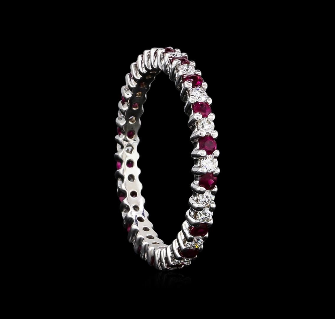 14K White Gold 0.70CT Diamond 0.90CT Ruby Ring. Description: Metal: 14k solid white gold. Face Measurements: 2.5mm. Size: 8.5. Shank Width: 2.5mm. Finish: bright polish. Total Item Weight: 2.5 grams. Markings: stamped 14K. Main Stone: diamond. Quantity: 19. Shape: round. Color: white. Carat Total Weight: 0.70. Measurements: 2mm. Treatment: none. Setting: none. Color Grade: G-H. Clarity: SI1-SI2. Cut: very good. Secondary Stone: ruby. Quantity: 18. Shape: round. Color: red. Carat Total Weight: 0.90. Measurements: 2.00mm. Treatment: none. Setting: prong. Hue: red-purple. Saturation: moderately strong. Tone: dark. Clarity: type 2. Cut: very good. Excellent Workmanship. Gemstones graded in the mounting. BHGL Appraised at $4,700.00.