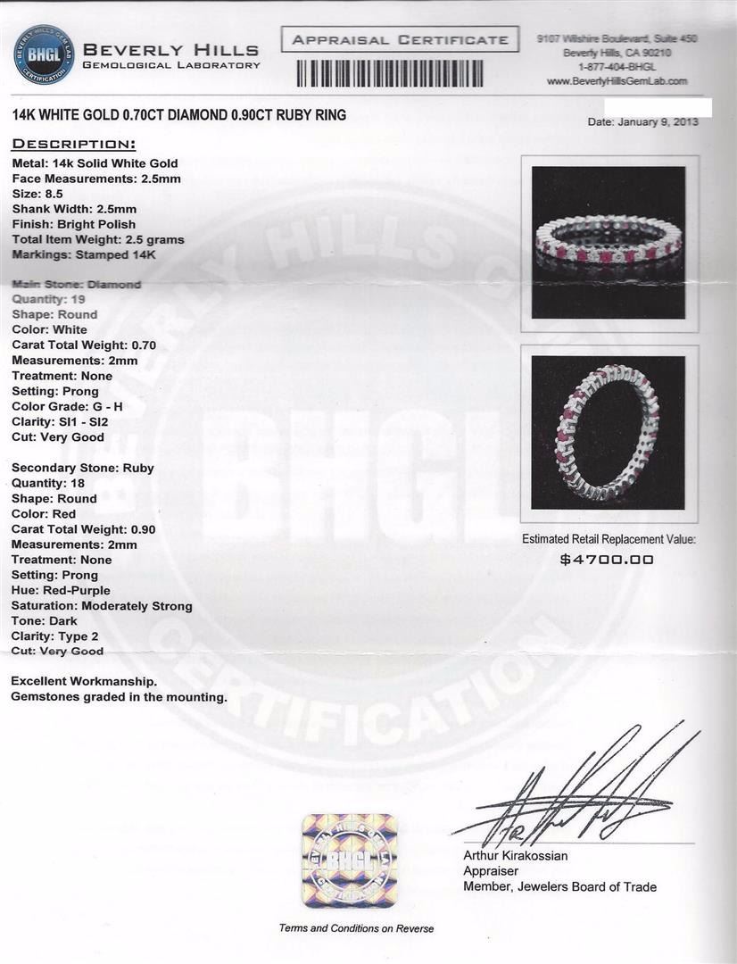 14K White Gold 0.70CT Diamond 0.90CT Ruby Ring. Description: Metal: 14k solid white gold. Face Measurements: 2.5mm. Size: 8.5. Shank Width: 2.5mm. Finish: bright polish. Total Item Weight: 2.5 grams. Markings: stamped 14K. Main Stone: diamond. Quantity: 19. Shape: round. Color: white. Carat Total Weight: 0.70. Measurements: 2mm. Treatment: none. Setting: none. Color Grade: G-H. Clarity: SI1-SI2. Cut: very good. Secondary Stone: ruby. Quantity: 18. Shape: round. Color: red. Carat Total Weight: 0.90. Measurements: 2.00mm. Treatment: none. Setting: prong. Hue: red-purple. Saturation: moderately strong. Tone: dark. Clarity: type 2. Cut: very good. Excellent Workmanship. Gemstones graded in the mounting. BHGL Appraised at $4,700.00.