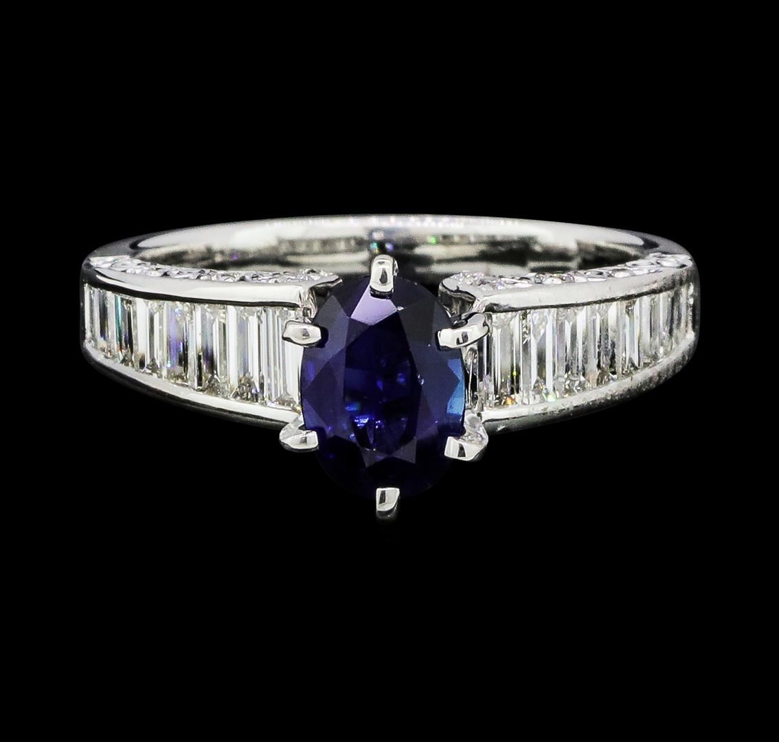 One lady's ring featuring: 18KT white gold weighing 3.7 grams containing one sapphire weighing 0.90ct and diamonds weighing 0.80ctw.