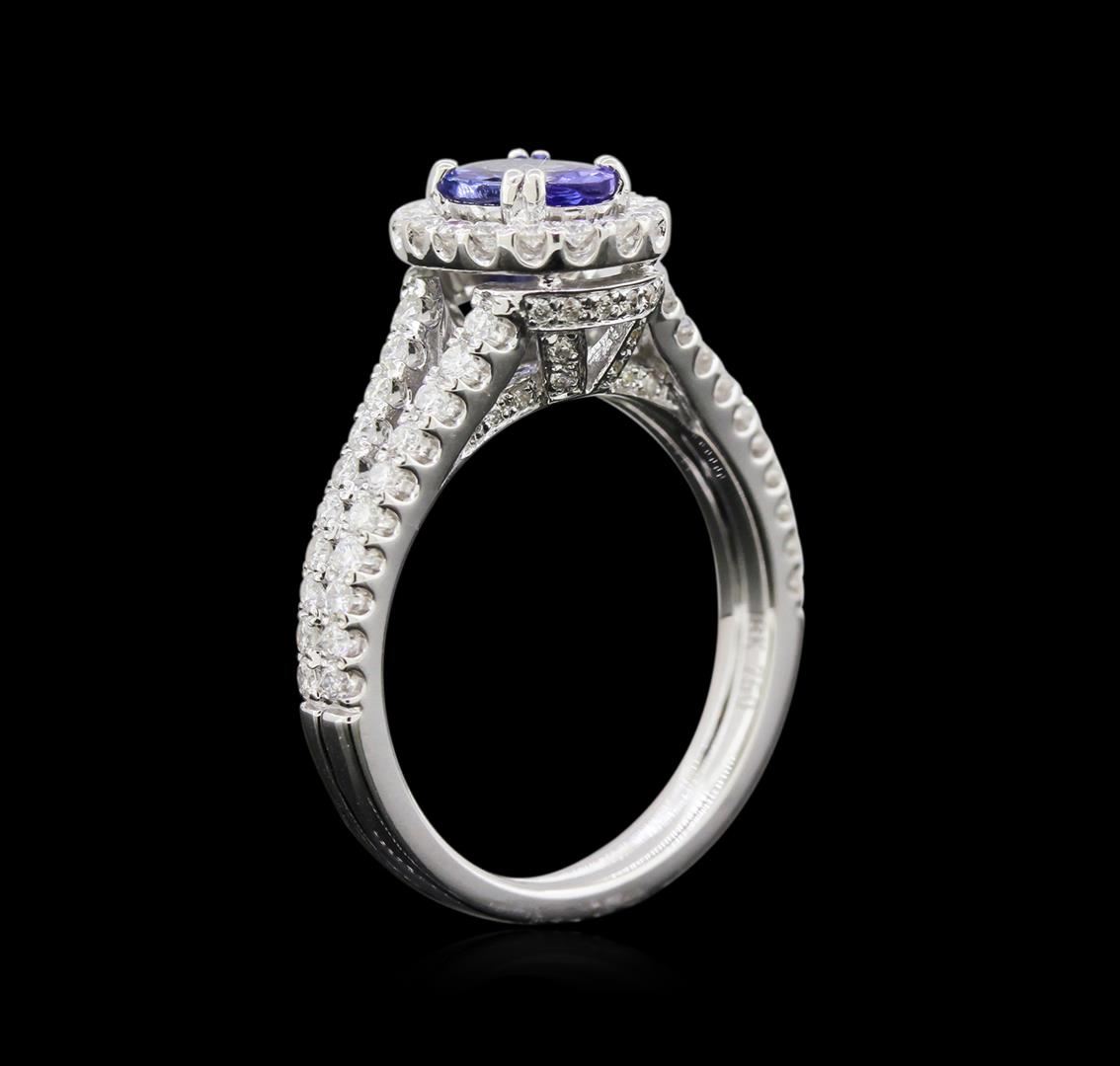 One electronically tested 18KT white gold ladies cast tanzanite and diamond ring with a bright polish finish. The featured tanzanite is set within a diamond bezel supported by an elaborate diamond set under gallery and diamond set split shoulders, completed by a two and one-half millimeter wide band. Identified with markings of "18K 750". Condition is good. Containing: One prong set oval mixed cut natural tanzanite, measuring 6.90 x 4.75 x 3.25mm, 30% bulge factor, approximate weight of 0.90ct., clarity is slightly included, type I, medium dark, very slightly grayish, bluish violet color, (GIA bV 6/3), cut is good. Transmitting light with a minimum of distortion, transparent. Naturally occurring internal & external characteristics are present. Graded in the setting. Tanzanite is a very rare gemstone that is only found in the country of Tanzania. Originally discovered in 1967. Tiffany & Company, named the stone Tanzanite. It is found in the Usumburu Mountains that border the Umba Valley of northern Tanzania. Tanzanite occurs in gray, brown, violet, blue, reddish-purple, & green. The gem is interesting because of its exceptional pleochroism. Rotated in different directions a tanzanite will exhibit multiple changes of color. Tanzanite has a low tolerance to ultrasonic cleaning, and should not be cleaned using this method. Fifty-Eight prong set round brilliant cut diamonds, measuring 1.50 - 1.40 x 0.87mm (depth est.) approximate total weight of 58 Stones = 0.65ct. Graded in the setting. Clarity: SI-1 to I-1. Color: G - I Twenty-Eight prong set round brilliant cut diamonds, measuring 0.90 - 0.80 x 0.51mm (depth est.) approximate total weight of 28 Stones = 0.07ct. Graded in the setting. Clarity: SI-1 to I-1. Color: G - I. Total Weight of Colored Stones 0.90ct. Total Weight of Diamonds 0.72ct. Total Weight of Ring 5.88gm. AIG Appraised at $4,760.00.