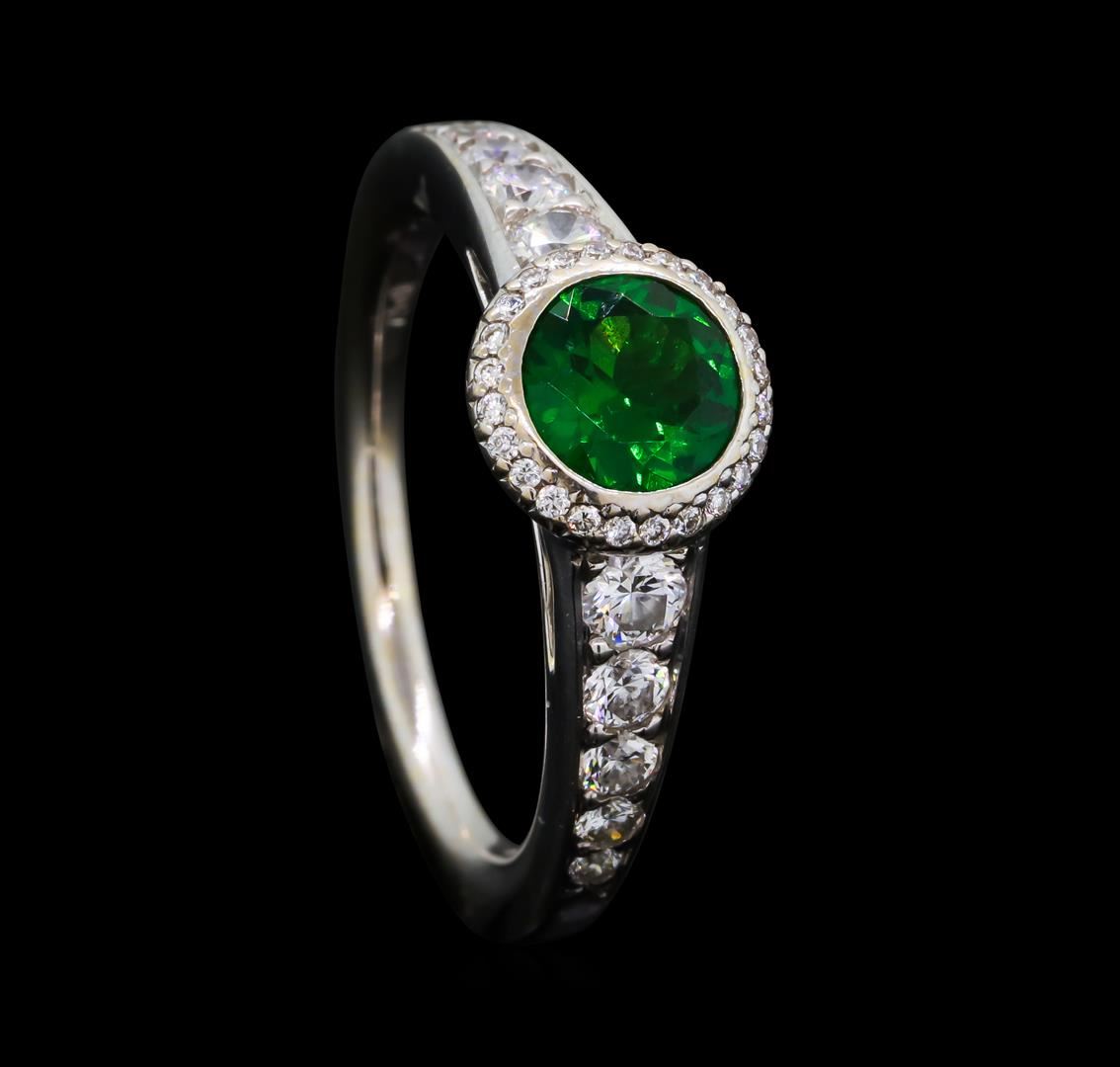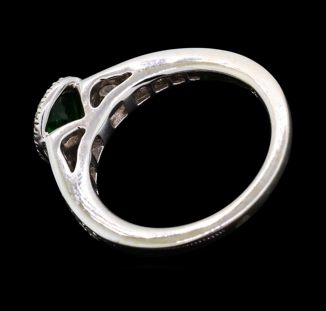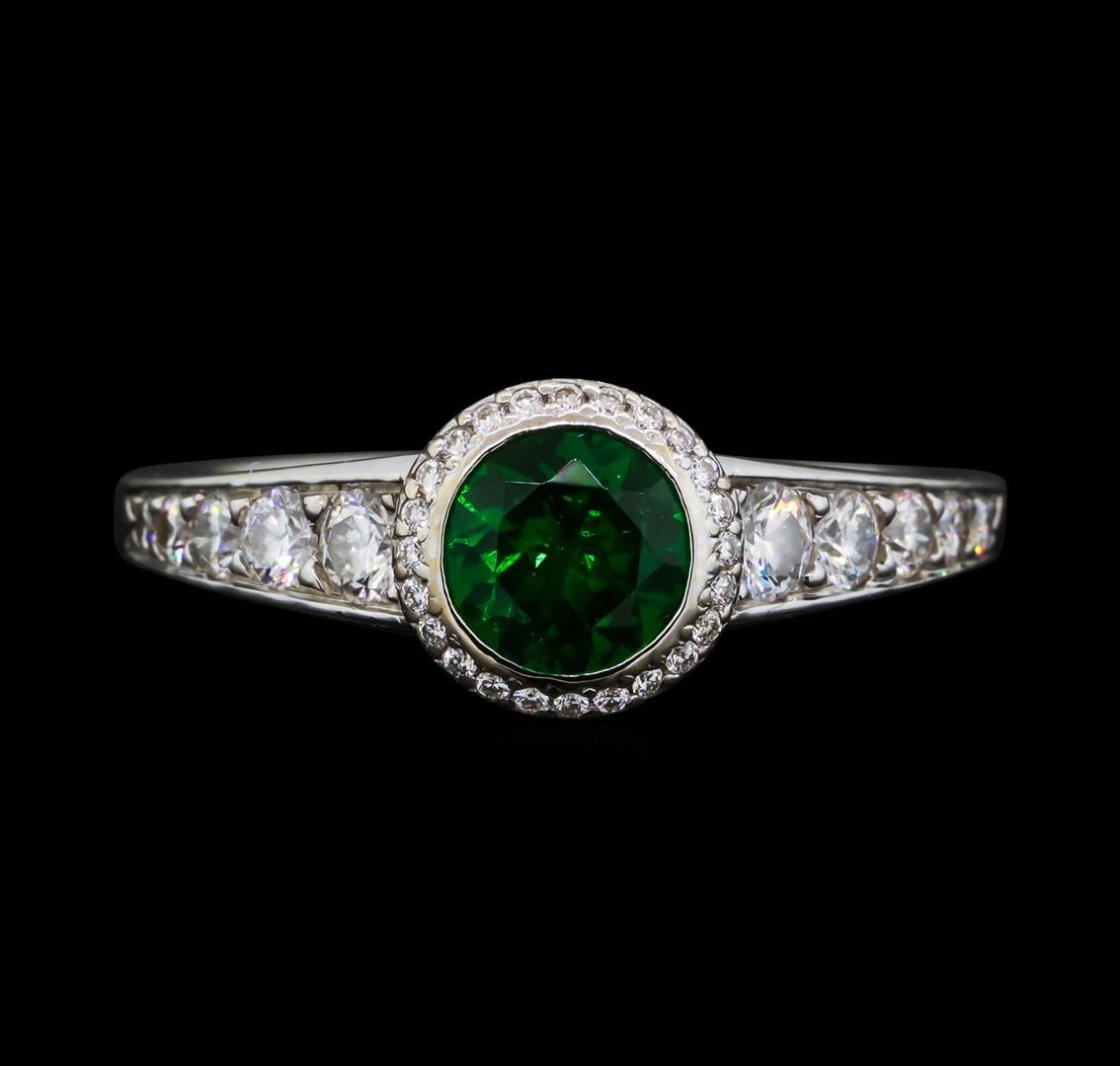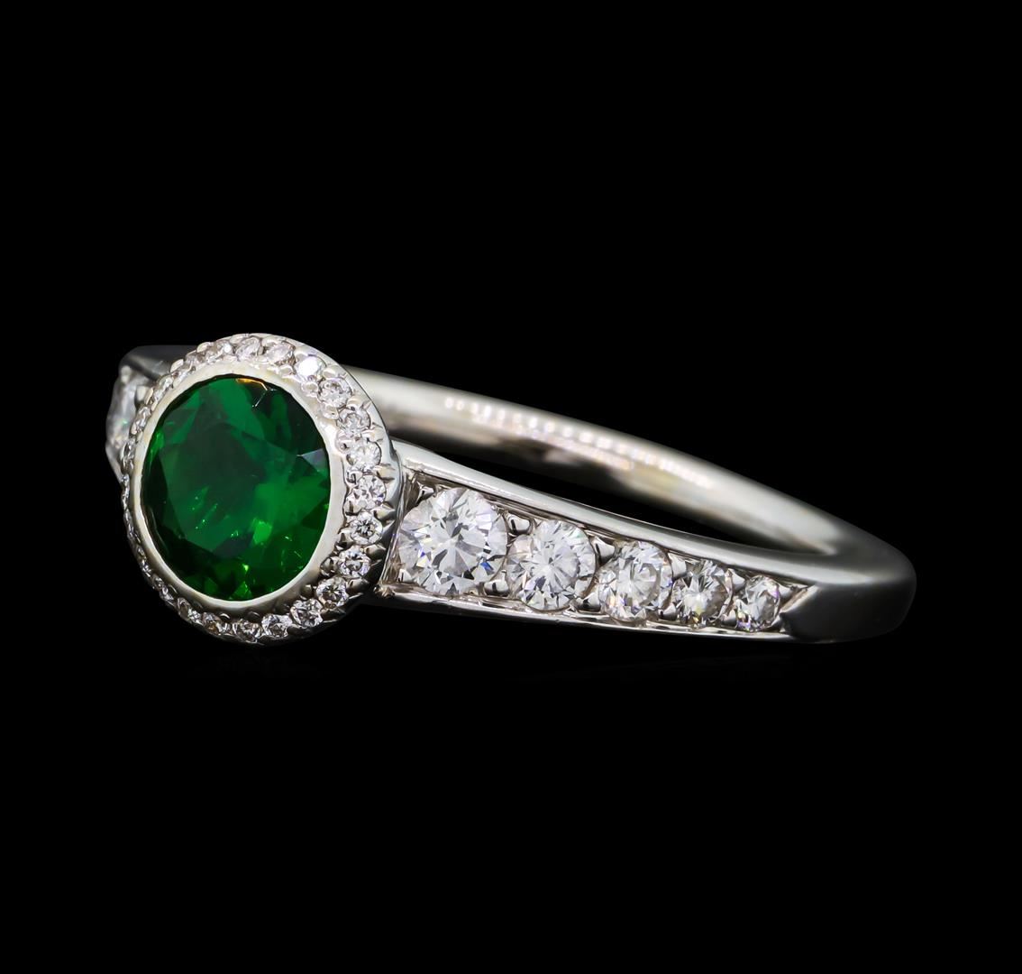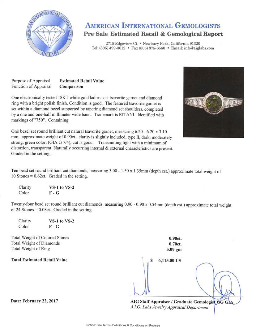 One electronically tested 18KT white gold ladies cast tsavorite garnet and diamond ring with a bright polish finish. The featured tsavorite garnet is set within a diamond bezel supported by tapering diamond set shoulders, completed by a one and one-half millimeter wide band. Trademark is RITANI. Identified with markings of '750'. Condition is good. Containing: One bezel set round brilliant cut natural tsavorite garnet, measuring 6.20 - 6.20 x 3.10 mm, approximate weight of 0.90ct., clarity is slightly included, type II, dark, moderately strong, green color, (GIA G 7/4), cut is good. Transmitting light with a minimum ofdistortion, transparent. Naturally occurring internal & external characteristics are present.Graded in the setting. Ten bead set round brilliant cut diamonds, measuring 3.00 - 1.50 x 1.35mm (depth est.) approximate total weight of 10 Stones = 0.62ct. Graded in the setting. Clarity VS-1 to VS-2. Color: F - G Twenty-Four bead set round brilliant cut diamonds, measuring 0.90 - 0.90 x 0.54mm (depth est.) approximate total weight of 24 Stones = 0.08ct. Graded in the setting. Clarity VS-1 to VS-2. Color: F - G. Total Weight of Colored Stones 0.90ct.. Total Weight of Diamonds 0.70ct.. Total Weight of Ring 5.09gm. AIG Appraised at $6,115.00.