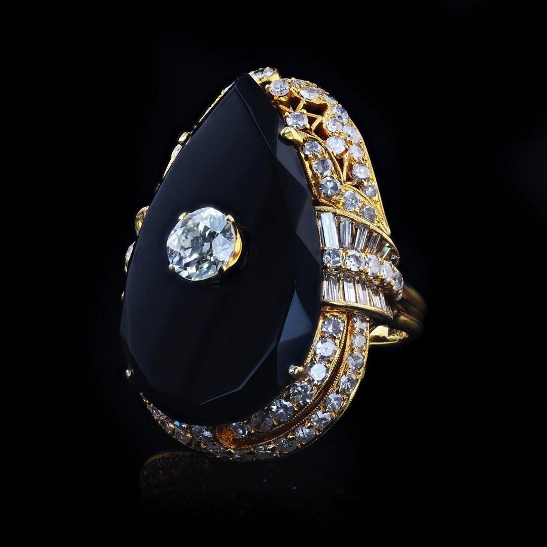 0.90ct VS1 CLARITY CENTER Diamond and 7.00ct Onyx 14K Yellow Gold Ring (2.40ctw Diamonds). One electronically tested 14KT yellow gold ladies cast and assembled diamond and onyx ring. The ring features a round brilliant diamond mounted upon a pear onyx stone, set within an elaborate diamond bezel, supported by a filigree lattice under gallery and three-way split shoulders, completed by a three millimeter wide band. Bright polish finish with milgrain detailing. Identified with markings of "14K". Condition is good. Containing:  One prong set pear tabular mixed cut natural onyx, measuring 29.60mm x 8.00mm x 3.20mm, black, strong, black color, (GIA Bl 10/5), cut is good. Transmitting light very diffusely, opaque. Graded in the setting.  One prong set Old European cut diamond, measuring 6.10mm to 6.10mm x 3.78mm (depth est.) approximate weight of 0.90ct. Cutting style circa mid 19th century. Graded in the setting. Clarity VS1 Color L  One Hundred Eight prong channel set round brilliant and baguette cut diamonds (depth est.) approximate total weight of 108 Stones = 1.50ct. The clarity and color grade reflect the overall average for the group. Graded in the setting. Clarity SI2 to I1 Color E - G  Total Weight of Colored Stones 7.00 ct. Total Weight of Diamonds 2.40 ct. Total Weight of Ring 12.50 gm