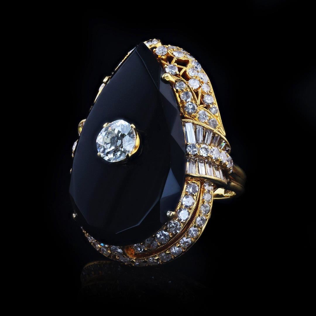 One electronically tested 14KT yellow gold ladies cast and assembled diamond and onyx ring. The ring features a round brilliant diamond mounted upon a pear onyx stone, set within an elaborate diamond bezel, supported by a filigree lattice under gallery and three-way split shoulders, completed by a three millimeter wide band. Bright polish finish with milgrain detailing. Identified with markings of "14K". Condition is good. Containing: One prong set pear tabular mixed cut natural onyx, measuring 29.60mm x 8.00mm x 3.20mm, black, strong, black color, (GIA Bl 10/5), cut is good. Transmitting light very diffusely, opaque. Graded in the setting. One prong set Old European cut diamond, measuring 6.10mm to 6.10mm x 3.78mm (depth est.) approximate weight of 0.90ct. Cutting style circa mid 19th century. Graded in the setting. Clarity VS1 Color L One Hundred Eight prong channel set round brilliant and baguette cut diamonds (depth est.) approximate total weight of 108 Stones = 1.50ct. The clarity and color grade reflect the overall average for the group. Graded in the setting. Clarity SI2 to I1 Color E - G Total Weight of Colored Stones 7.00 ct. Total Weight of Diamonds 2.40 ct. Total Weight of Ring 12.50 gm #LREF-6695
