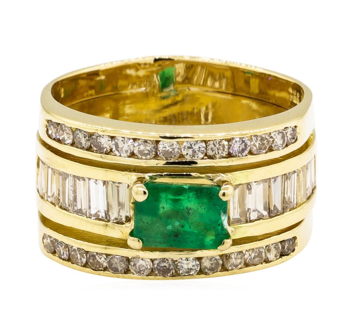 One electronically tested 18KT yellow gold lady's combination cast & assembled fashion ring with a three row wide band with a bright polish finish. The featured lady's ring consists of three soldered bands and has a triple shank measuring 9.30 millimeters wide. Identified with markings of '750'. Condition is used, good workmanship. Containing: One prong set emerald modified step cut natural emerald, measuring 6.26 x 4.48 x 3.90mm, (depth est.) 10%. bulge factor, approximate weight of 0.90ct., clarity is heavily included, medium dark, moderately strong, green color, (GIA G 6/4), cut is good. Transmitting light somewhat diffusely, semi-transparent to translucent. Naturally occurring internal & external characteristics are present. Indications of oil residue. Colored gemstones are presumed to have been subjected to commonly used enhancement processes. Graded in the setting. Fourteen channel set baguette cut diamonds, measuring from 2.90 x 1.60 x 1.36mm (depth est.) to 3.10 x 1.80 x 1.53mm (depth est.) approximate total weight of 14 Stones = 0.85ct. Graded in the setting. Color I - J Clarity VS-2 to SI-1 Cut Good Twenty-Six channel set round brilliant cut diamonds, measuring 1.70 - 1.65 x 1.04mm (depth est.) approximate total weight of 26 Stones = 0.50ct. Graded in the setting. Color I - K Clarity SI-1 to I-1 Cut Good. Total Weight of Colored Stones 0.90ct.. Total Weight of Diamonds 1.35ct.. Total Weight of Ring 7.50gm GAS Appraised at $4450.00. GAS Appraised at $4,450.00.
