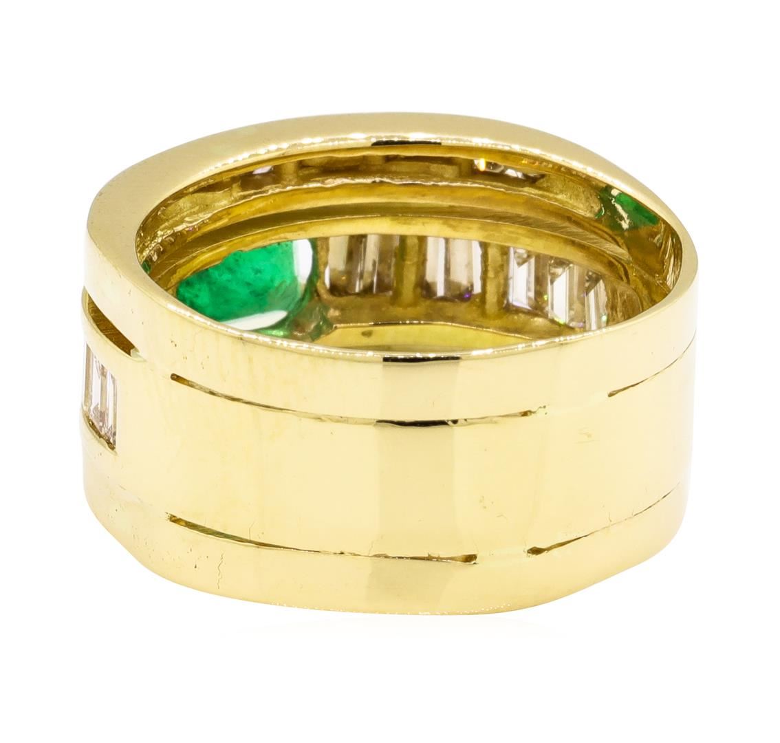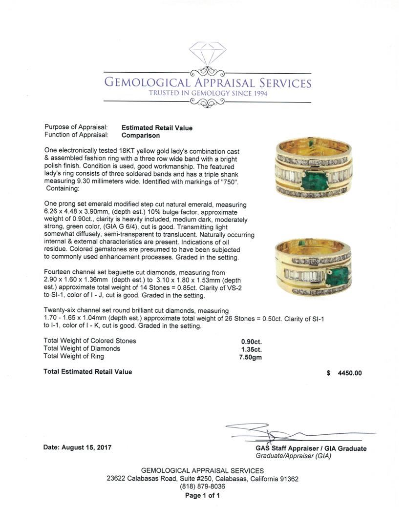 One electronically tested 18KT yellow gold lady's combination cast & assembled fashion ring with a three row wide band with a bright polish finish. The featured lady's ring consists of three soldered bands and has a triple shank measuring 9.30 millimeters wide. Identified with markings of '750'. Condition is used, good workmanship. Containing: One prong set emerald modified step cut natural emerald, measuring 6.26 x 4.48 x 3.90mm, (depth est.) 10%. bulge factor, approximate weight of 0.90ct., clarity is heavily included, medium dark, moderately strong, green color, (GIA G 6/4), cut is good. Transmitting light somewhat diffusely, semi-transparent to translucent. Naturally occurring internal & external characteristics are present. Indications of oil residue. Colored gemstones are presumed to have been subjected to commonly used enhancement processes. Graded in the setting. Fourteen channel set baguette cut diamonds, measuring from 2.90 x 1.60 x 1.36mm (depth est.) to 3.10 x 1.80 x 1.53mm (depth est.) approximate total weight of 14 Stones = 0.85ct. Graded in the setting. Color I - J Clarity VS-2 to SI-1 Cut Good Twenty-Six channel set round brilliant cut diamonds, measuring 1.70 - 1.65 x 1.04mm (depth est.) approximate total weight of 26 Stones = 0.50ct. Graded in the setting. Color I - K Clarity SI-1 to I-1 Cut Good. Total Weight of Colored Stones 0.90ct.. Total Weight of Diamonds 1.35ct.. Total Weight of Ring 7.50gm GAS Appraised at $4450.00. GAS Appraised at $4,450.00.