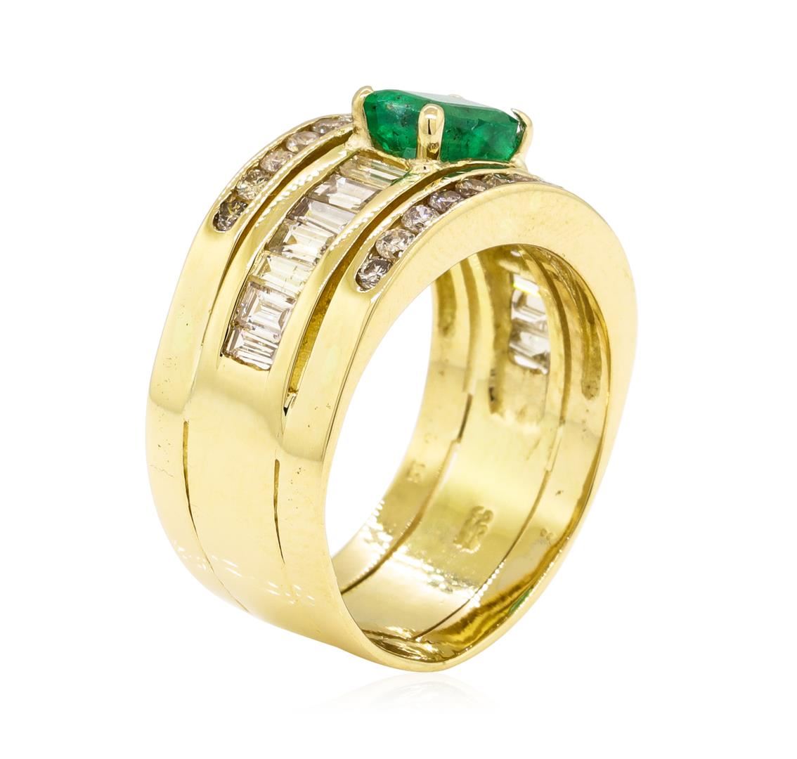 One electronically tested 18KT yellow gold lady's combination cast & assembled fashion ring with a three row wide band with a bright polish finish. The featured lady's ring consists of three soldered bands and has a triple shank measuring 9.30 millimeters wide. Identified with markings of '750'. Condition is used, good workmanship. Containing: One prong set emerald modified step cut natural emerald, measuring 6.26 x 4.48 x 3.90mm, (depth est.) 10%. bulge factor, approximate weight of 0.90ct., clarity is heavily included, medium dark, moderately strong, green color, (GIA G 6/4), cut is good. Transmitting light somewhat diffusely, semi-transparent to translucent. Naturally occurring internal & external characteristics are present. Indications of oil residue. Colored gemstones are presumed to have been subjected to commonly used enhancement processes. Graded in the setting. Fourteen channel set baguette cut diamonds, measuring from 2.90 x 1.60 x 1.36mm (depth est.) to 3.10 x 1.80 x 1.53mm (depth est.) approximate total weight of 14 Stones = 0.85ct. Graded in the setting. Color I - J Clarity VS-2 to SI-1 Cut Good Twenty-Six channel set round brilliant cut diamonds, measuring 1.70 - 1.65 x 1.04mm (depth est.) approximate total weight of 26 Stones = 0.50ct. Graded in the setting. Color I - K Clarity SI-1 to I-1 Cut Good. Total Weight of Colored Stones 0.90ct.. Total Weight of Diamonds 1.35ct.. Total Weight of Ring 7.50gm GAS Appraised at $4450.00. GAS Appraised at $4,450.00.