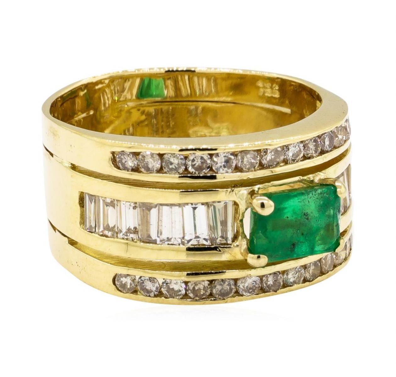 One electronically tested 18KT yellow gold lady's combination cast & assembled fashion ring with a three row wide band with a bright polish finish. The featured lady's ring consists of three soldered bands and has a triple shank measuring 9.30 millimeters wide. Identified with markings of '750'. Condition is used, good workmanship. Containing: One prong set emerald modified step cut natural emerald, measuring 6.26 x 4.48 x 3.90mm, (depth est.) 10%. bulge factor, approximate weight of 0.90 ct., clarity is heavily included, medium dark, moderately strong, green color, (GIA G 6/4), cut is good. Transmitting light somewhat diffusely, semi-transparent to translucent. Naturally occurring internal & external characteristics are present. Indications of oil residue. Colored gemstones are presumed to have been subjected to commonly used enhancement processes. Graded in the setting. Fourteen channel set baguette cut diamonds, measuring from 2.90 x 1.60 x 1.36mm (depth est.) to 3.10 x 1.80 x 1.53mm (depth est.) approximate total weight of 14 Stones = 0.85ct. Graded in the setting. Color I - J Clarity VS-2 to SI-1 Cut Good Twenty-Six channel set round brilliant cut diamonds, measuring 1.70 - 1.65 x 1.04mm (depth est.) approximate total weight of 26 Stones = 0.50 ct. Graded in the setting. Color I - K Clarity SI-1 to I-1 Cut Good. Total Weight of Colored Stones 0.90 ct.. Total Weight of Diamonds 1.35ct.. Total Weight of Ring 7.50gm GAS Appraised at  $4450.00. GAS Appraised.