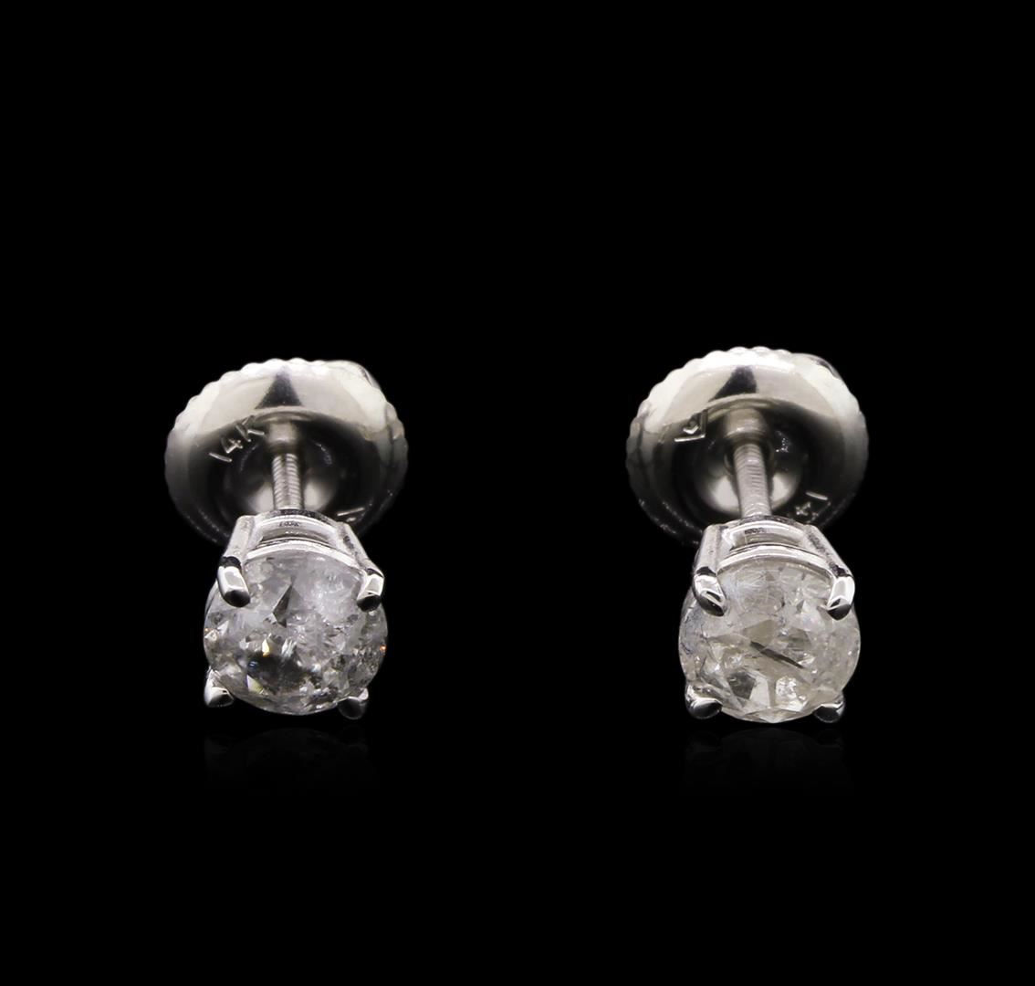 One pair electronically tested 14KT white gold cast & assembled diamond solitaire earrings with screw backs. Identified with markings of "14K". Condition is new, good workmanship. Containing: One prong set round brilliant cut diamond, measuring 4.80 - 4.80 x 3.10mm (depth est.), 3.00% GTCF approximate weight of 0.45ct with a medium strong blue fluorescence. Graded in the setting. Clarity: I-3. Color: 64.6%. Table 58.3%. One prong set round brilliant cut diamond, measuring 4.70 - 4.70 x 3.20mm (depth est.), 5.00% GTCF approximate weight of 0.45ct with a very strong blue fluorescence. Graded in the setting. Clarity: I-3. Color: I. Depth 68.1%. Table 55.3%. Total Weight of Diamonds 0.90ct. Total Weight of Earrings 0.90gm. AIG Appraised at $1,740.00.