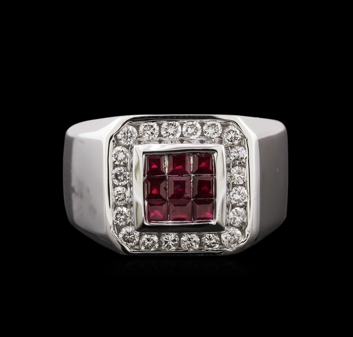 One electronically tested 14KT white gold man's cast fashion ring with a tapered shank with a bright polish finish. Condition is new. Identified with markings of "14K". Containing: Nine invisible set princess brilliant cut natural rubies, measuring 2.40 x 2.30 x 1.50mm, 20% bulge factor, approximate total weight of 0.90ct., clarity is slightly included, type II, medium dark, moderately strong, red color, (GIA R 6/4), cut is good. Colored gemstones are presumed to have been subjected to commonly used enhancement processes. Naturally occurring internal and external characteristics are present. Graded in the setting. Twenty channel set round brilliant cut diamonds, measuring 2.10 - 2.00 x 1.23mm (depth est.) approximate total weight of 20 Stones = 0.68ct. Graded in the setting. Clarity: SI-1 to I-1. Color: G - I. Cut: Good. Total Weight of Colored Stones: 0.90ct. Total Weight of Diamonds: 0.68ct. Total Weight of Ring: 10.00 gm. Gemological Appraisal Services at $5,735.00.
