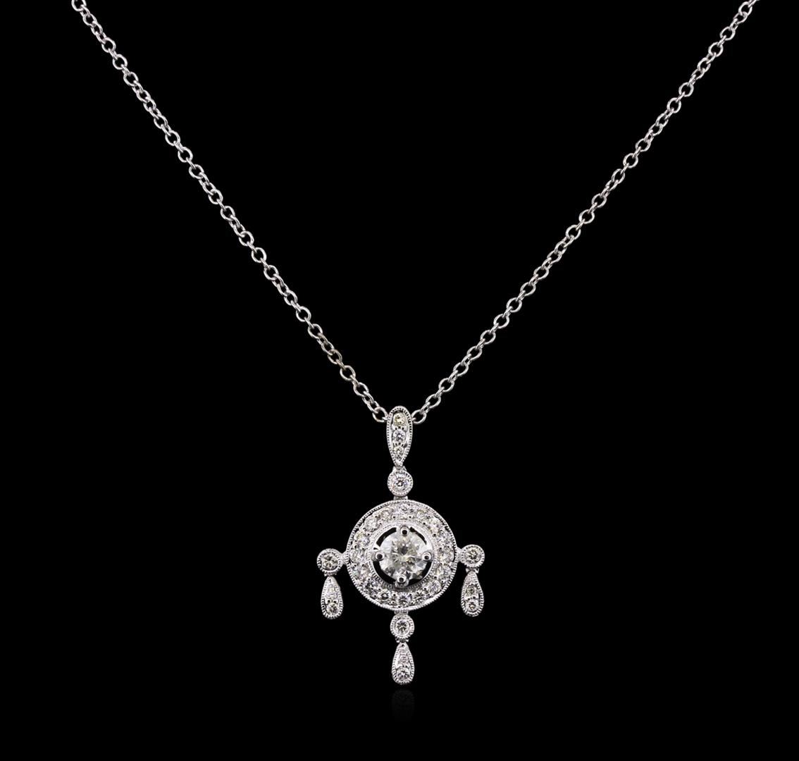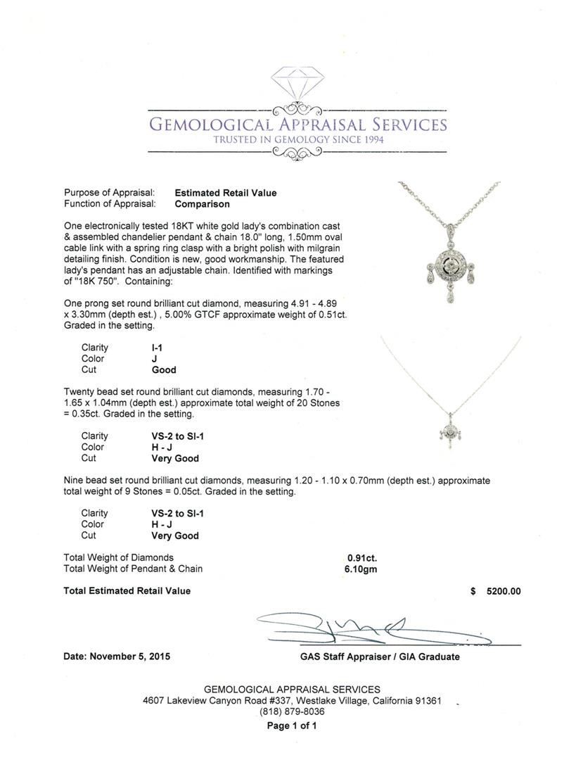 One electronically tested 18KT white gold lady's combination cast & assembled chandelier pendant & chain 18.0" long, 1.50mm oval cable link with a spring ring clasp with a bright polish with milgrain detailing finish. The featured lady's pendant has an adjustable chain. Identified with markings of "18K 750". Condition is new, good workmanship. Containing: One prong set round brilliant cut diamond, measuring 4.91 - 4.89 x 3.30mm (depth est.) , 5.00% GTCF approximate weight of 0.51ct. Graded in the setting. Clarity: I-1. Color: Good Twenty bead set round brilliant cut diamonds, measuring 1.70 - 1.65 x 1.04mm (depth est.) approximate total weight of 20 Stones = 0.35ct. Graded in the setting. Clarity: VS-2 to SI-1. Color: H - Very Good Nine bead set round brilliant cut diamonds, measuring 1.20 - 1.10 x 0.70mm (depth est.) approximate total weight of 9 Stones = 0.05ct. Graded in the setting. Clarity: VS-2 to SI-1. Color: H - Very Good. Total Weight of Diamonds 0.91ct. Total Weight of Pendant & Chain 6.10gm GAS Appraised at $5,200.00.