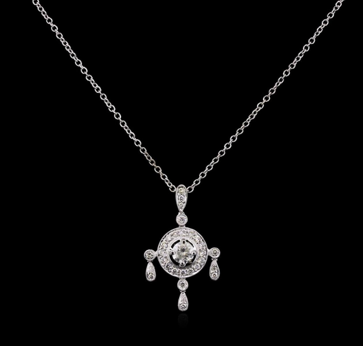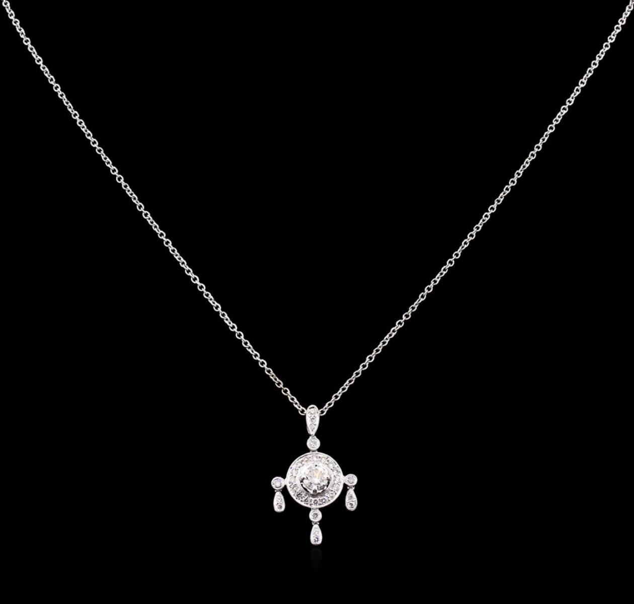 One electronically tested 18KT white gold lady's combination cast & assembled chandelier pendant & chain 18.0" long, 1.50mm oval cable link with a spring ring clasp with a bright polish with milgrain detailing finish. The featured lady's pendant has an adjustable chain. Identified with markings of "18K 750". Condition is new, good workmanship. Containing: One prong set round brilliant cut diamond, measuring 4.91 - 4.89 x 3.30mm (depth est.) , 5.00% GTCF approximate weight of 0.51ct. Graded in the setting. Clarity: I-1. Color: Good Twenty bead set round brilliant cut diamonds, measuring 1.70 - 1.65 x 1.04mm (depth est.) approximate total weight of 20 Stones = 0.35ct. Graded in the setting. Clarity: VS-2 to SI-1. Color: H - Very Good Nine bead set round brilliant cut diamonds, measuring 1.20 - 1.10 x 0.70mm (depth est.) approximate total weight of 9 Stones = 0.05ct. Graded in the setting. Clarity: VS-2 to SI-1. Color: H - Very Good. Total Weight of Diamonds 0.91ct. Total Weight of Pendant & Chain 6.10gm GAS Appraised.