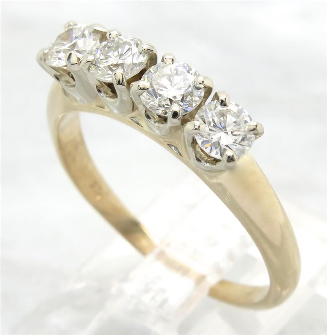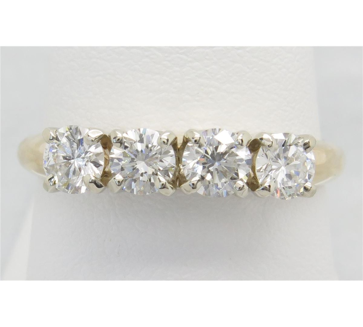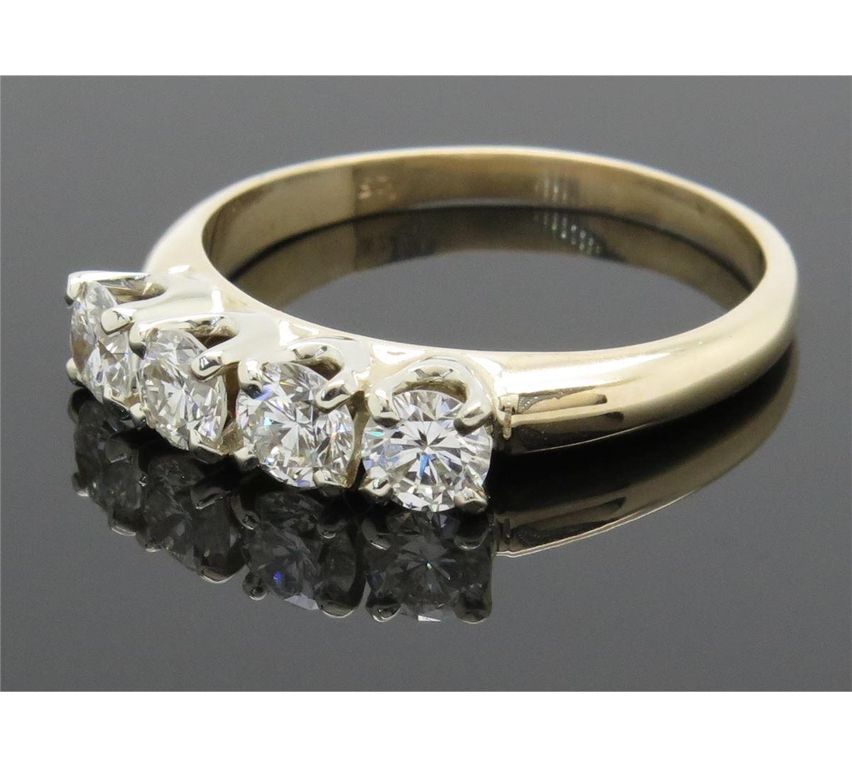 One tested 14K yellow gold diamond ring. Containing: Four Round Brilliant Cut Diamonds. Clarity: SI, Color: G-I. Approximate total diamond weight: .91CTW. Diamonds are graded in the mounting, unless otherwise stated. Weight: 3.7 grams, Size: 7.75.