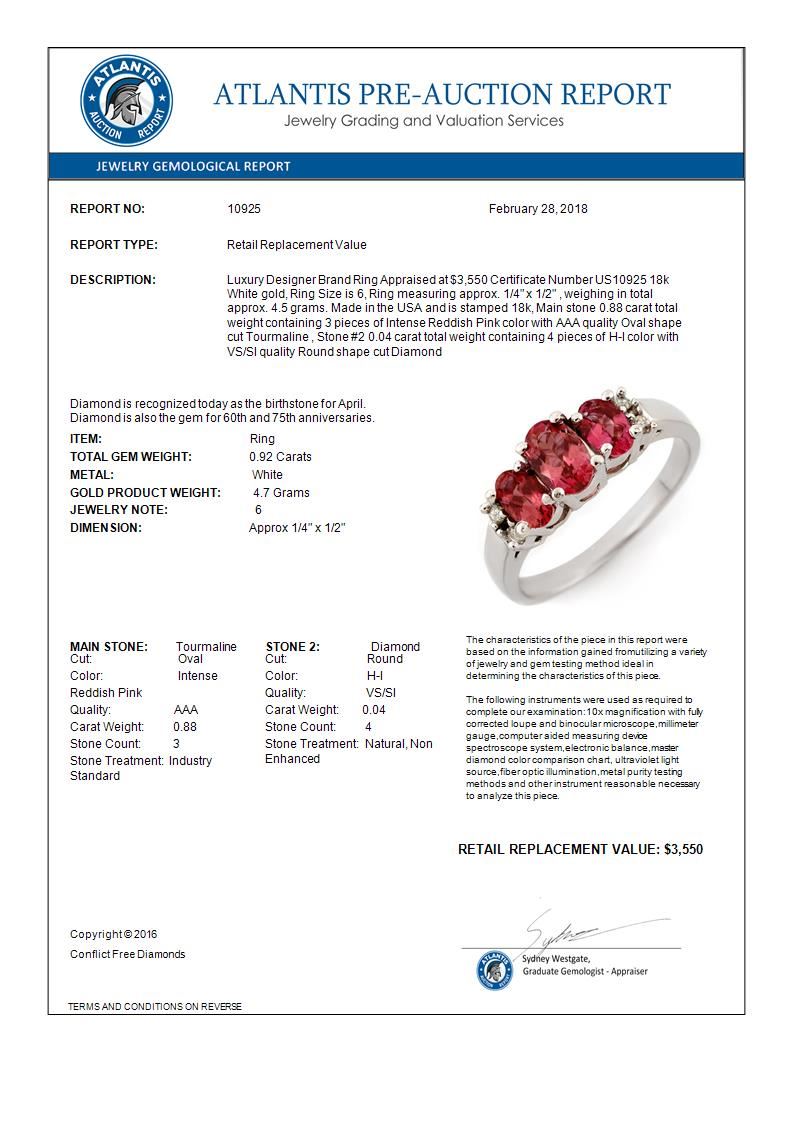 REF-46M2H -10925 ---- 0.92 CTW Pink Tourmaline & Diamond Ring 18K White Gold ---- Luxury Designer Brand Ring Appraised at $3,550 Certificate Number US10925 18k White gold, Ring Size is 6, Ring measuring approx. 1/4" x 1/2" , weighing in total approx. 4.5 grams. Made in the USA and is stamped 18k, Main stone 0.88 carat total weight containing 3 pieces of Intense Reddish Pink color with AAA quality Oval shape cut Tourmaline , Stone #2 0.04 carat total weight containing 4 pieces of H-I color with VS/SI quality Round shape cut Diamond