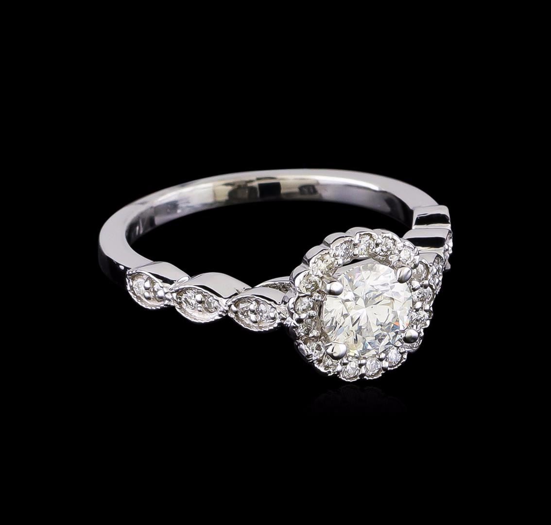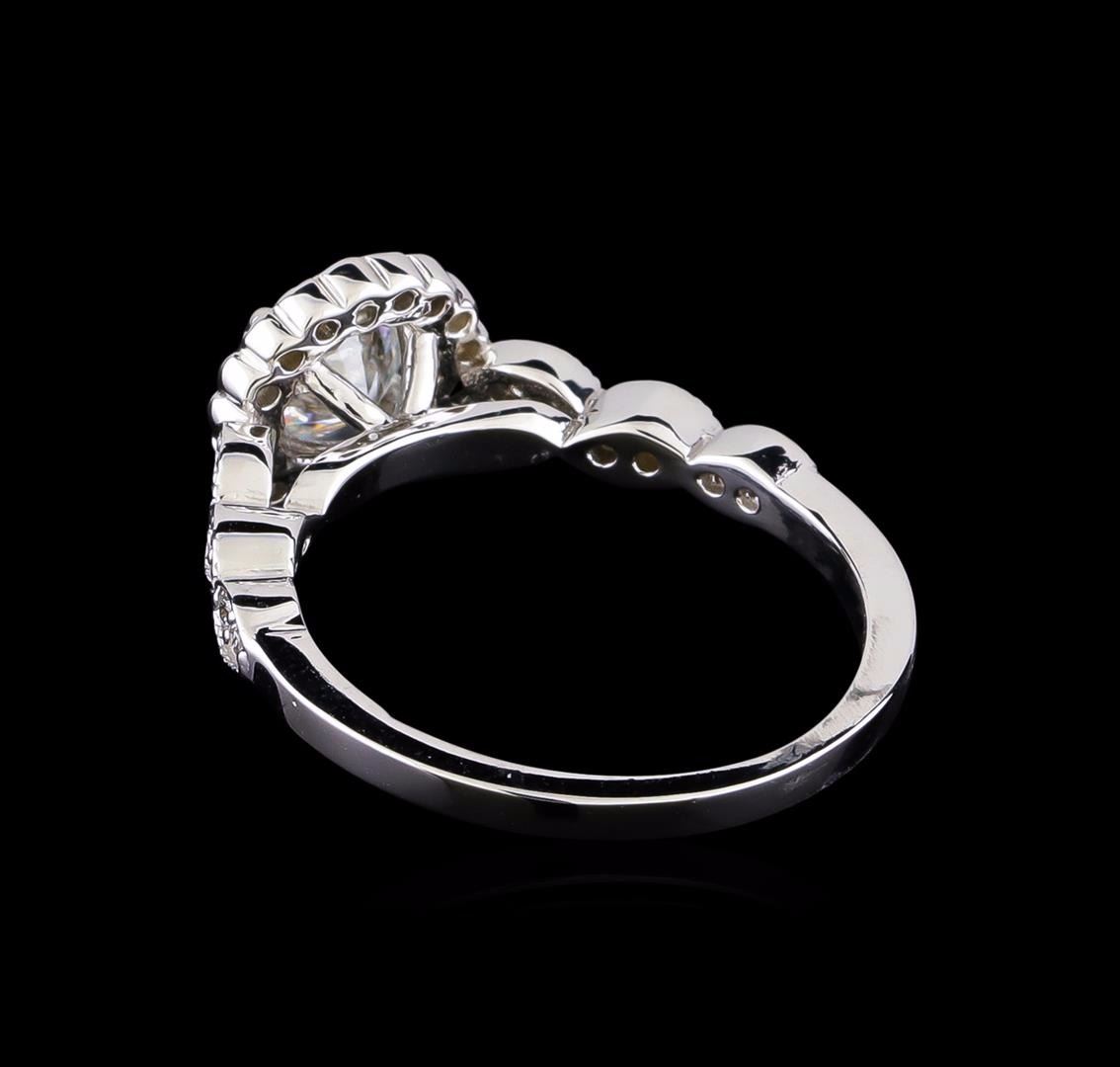 One electronically tested 14KT white gold lady's cast wedding ring with a scalloped shank halo with a bright polish with milgrain detailing finish. The featured lady's ring has a shank measuring 1.83 millimeters in width. Identified with markings of "14K". Condition is new, good workmanship. Containing: One prong set round brilliant cut diamond, measuring 5.68 - 5.65 x 3.52mm (depth est.) , 5.00.%. GTCF approximate weight of 0.72ct. Graded in the setting. Clarity: SI-2. Color: Very Good Twenty-Eight prong set round brilliant cut diamonds, measuring 1.30 - 1.20 x 0.78mm (depth est.) approximate total weight of 28 Stones = 0.20ct. Graded in the setting. Clarity: VS-2 to SI-2. Color: H - I. Cut Good. Total Weight of Diamonds 0.92ct. Total Weight of Ring 3.40gm GAS Appraised at $6,985.00.