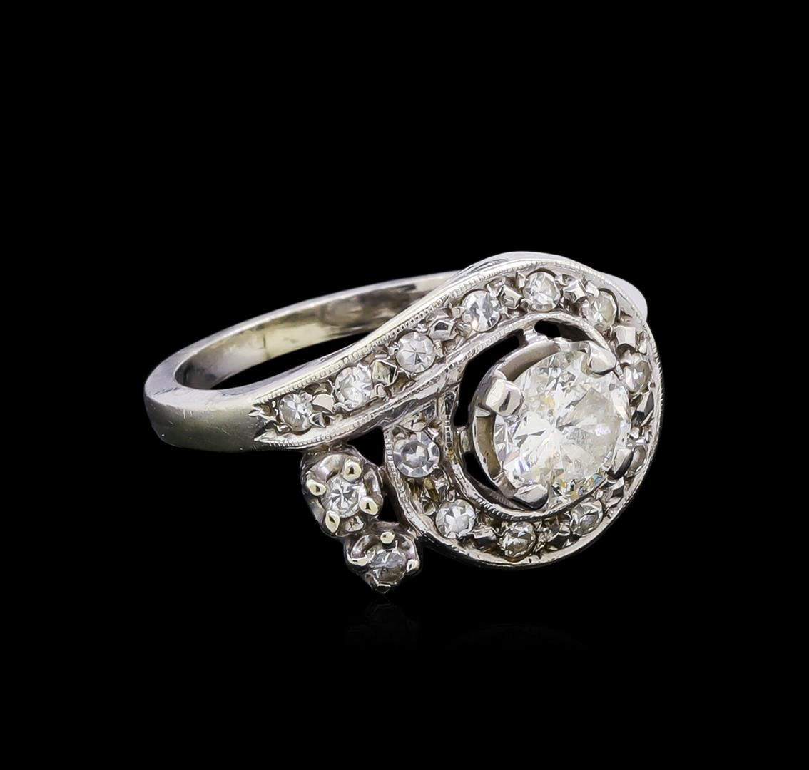 One electronically tested 14KT white gold ladies cast diamond unity ring. The featured diamond is set within a wrapping diamond bezel with two diamond accents, completed by a one millimeter wide band. Bright polish finish with milgrain detailing. Identified with markings of "14K". Condition is good. Containing: One prong set round brilliant cut diamond, measuring 5.75 - 5.70 x 3.20mm (depth est.) approximate weight of 0.65ct with a faint blue fluorescence. Graded in the setting. Clarity: I-2. Color: J. Depth 55.9%. Table 69.8%. Fourteen prong set single cut diamonds, measuring 1.80 - 1.60 x 1.02mm (depth est.) approximate total weight of 14 Stones = 0.27ct. Graded in the setting. Clarity: VS-2 to SI-1. Color: H - I. Total Weight of Diamonds 0.92ct. Total Weight of Ring 3.20gm. AIG Appraised at $3,460.00.