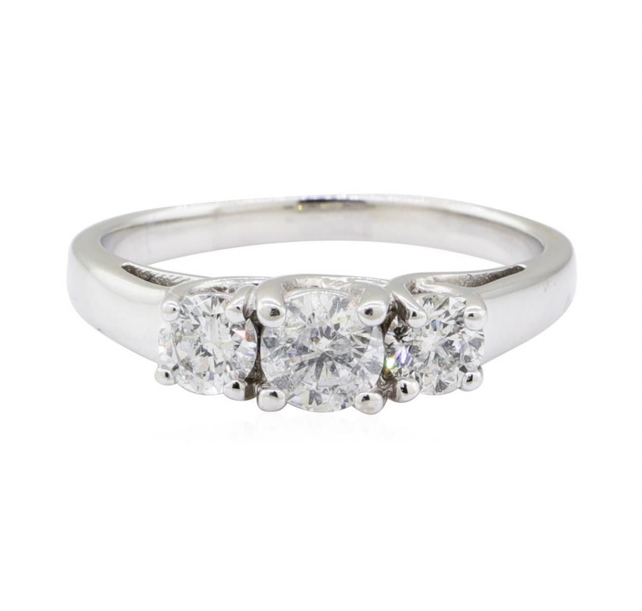 One electronically tested 14KT white gold lady's cast fashion ring with a three stone scalloped gallery with a bright polish finish. The featured lady's ring has a shank measuring 2.00 millimeters wide. Identified with markings of '14K'. Condition is like new, good workmanship. Containing: One prong set round brilliant cut diamond, measuring 4.81 - 4.75 x 3.02mm (depth est.) approximate weight of 0.44ct. Graded in the setting. Color H Clarity I-1 Cut Good Two prong set round brilliant cut diamonds, measuring 4.00 - 3.94 x 2.46mm (depth est.) approximate total weight of 2 Stones = 0.48ct. Graded in the setting. Color H - I Clarity SI-2 to I-1 Cut Good. Total Weight of Diamonds 0.92ct.. Total Weight of Ring 3.60gm GAS Appraised at $2935.00. GAS Appraised.