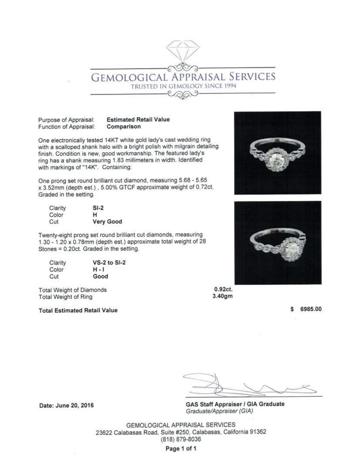 One electronically tested 14KT white gold lady's cast wedding ring with a scalloped shank halo with a bright polish with milgrain detailing finish. The featured lady's ring has a shank measuring 1.83 millimeters in width. Identified with markings of "14K". Condition is new, good workmanship. Containing: One prong set round brilliant cut diamond, measuring 5.68 - 5.65 x 3.52mm (depth est.) , 5.00.%. GTCF approximate weight of 0.72ct. Graded in the setting. Clarity: SI-2. Color: Very Good Twenty-Eight prong set round brilliant cut diamonds, measuring 1.30 - 1.20 x 0.78mm (depth est.) approximate total weight of 28 Stones = 0.20ct. Graded in the setting. Clarity: VS-2 to SI-2. Color: H - I. Cut Good. Total Weight of Diamonds 0.92ct. Total Weight of Ring 3.40gm GAS Appraised.