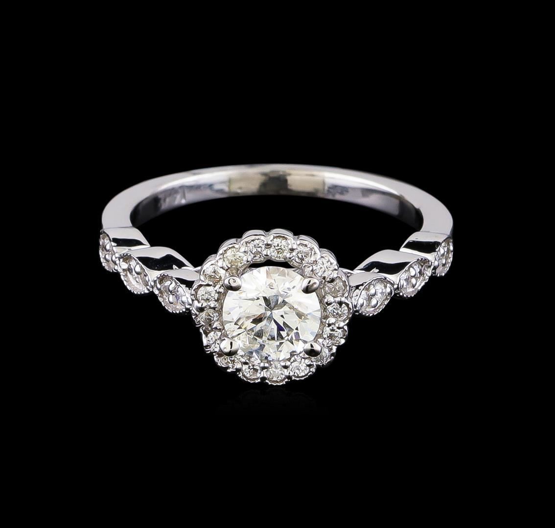 One electronically tested 14KT white gold lady's cast wedding ring with a scalloped shank halo with a bright polish with milgrain detailing finish. The featured lady's ring has a shank measuring 1.83 millimeters in width. Identified with markings of "14K". Condition is new, good workmanship. Containing: One prong set round brilliant cut diamond, measuring 5.68 - 5.65 x 3.52mm (depth est.) , 5.00.%. GTCF approximate weight of 0.72ct. Graded in the setting. Clarity: SI-2. Color: Very Good Twenty-Eight prong set round brilliant cut diamonds, measuring 1.30 - 1.20 x 0.78mm (depth est.) approximate total weight of 28 Stones = 0.20 ct. Graded in the setting. Clarity: VS-2 to SI-2. Color: H - I. Cut Good. Total Weight of Diamonds 0.92ct. Total Weight of Ring 3.40gm GAS Appraised.