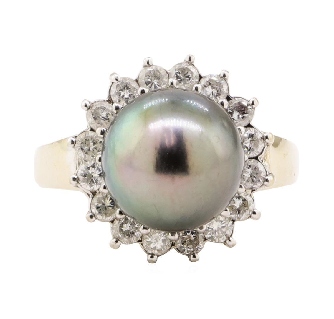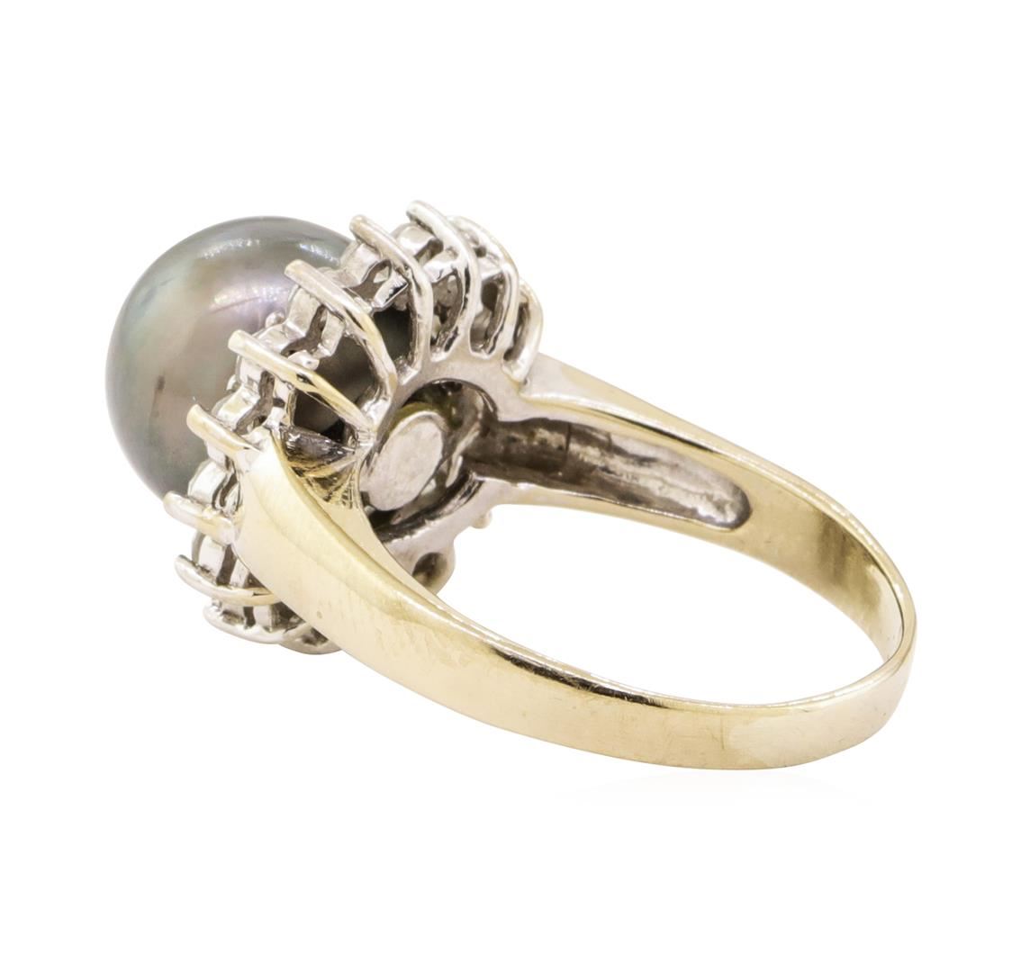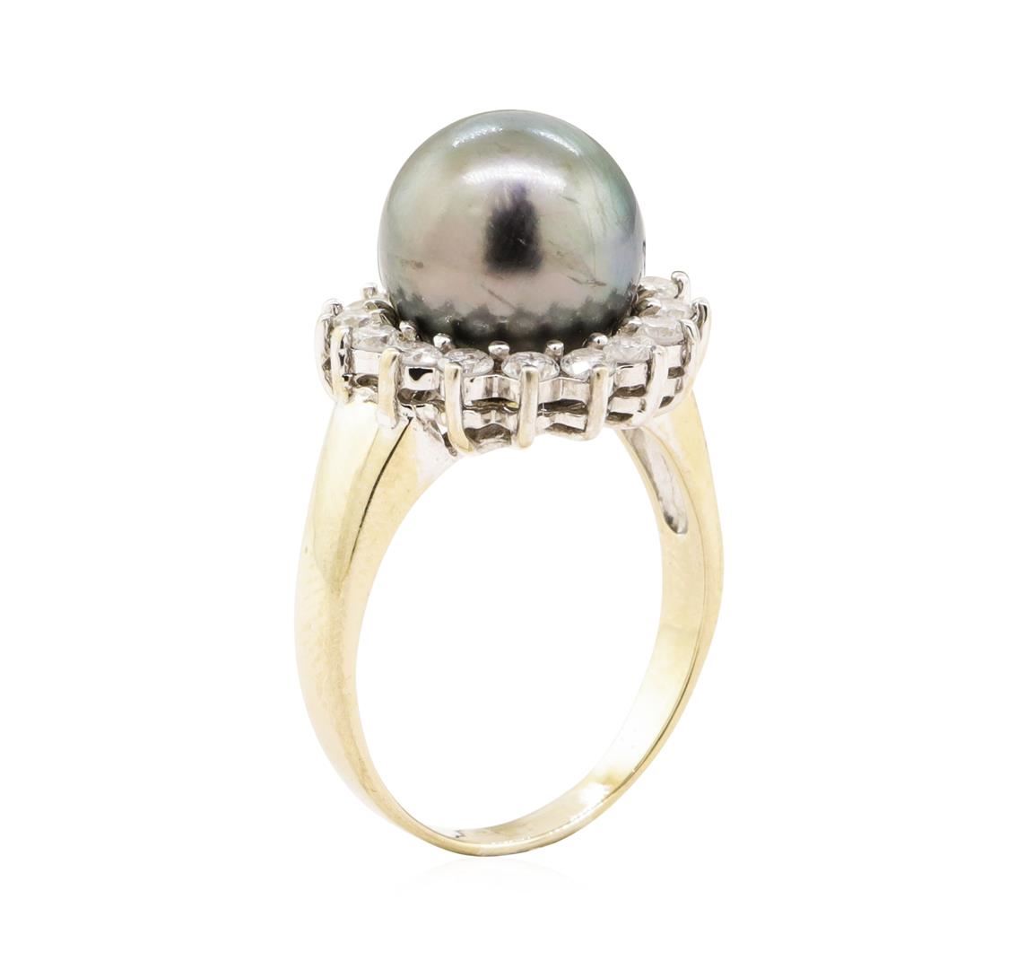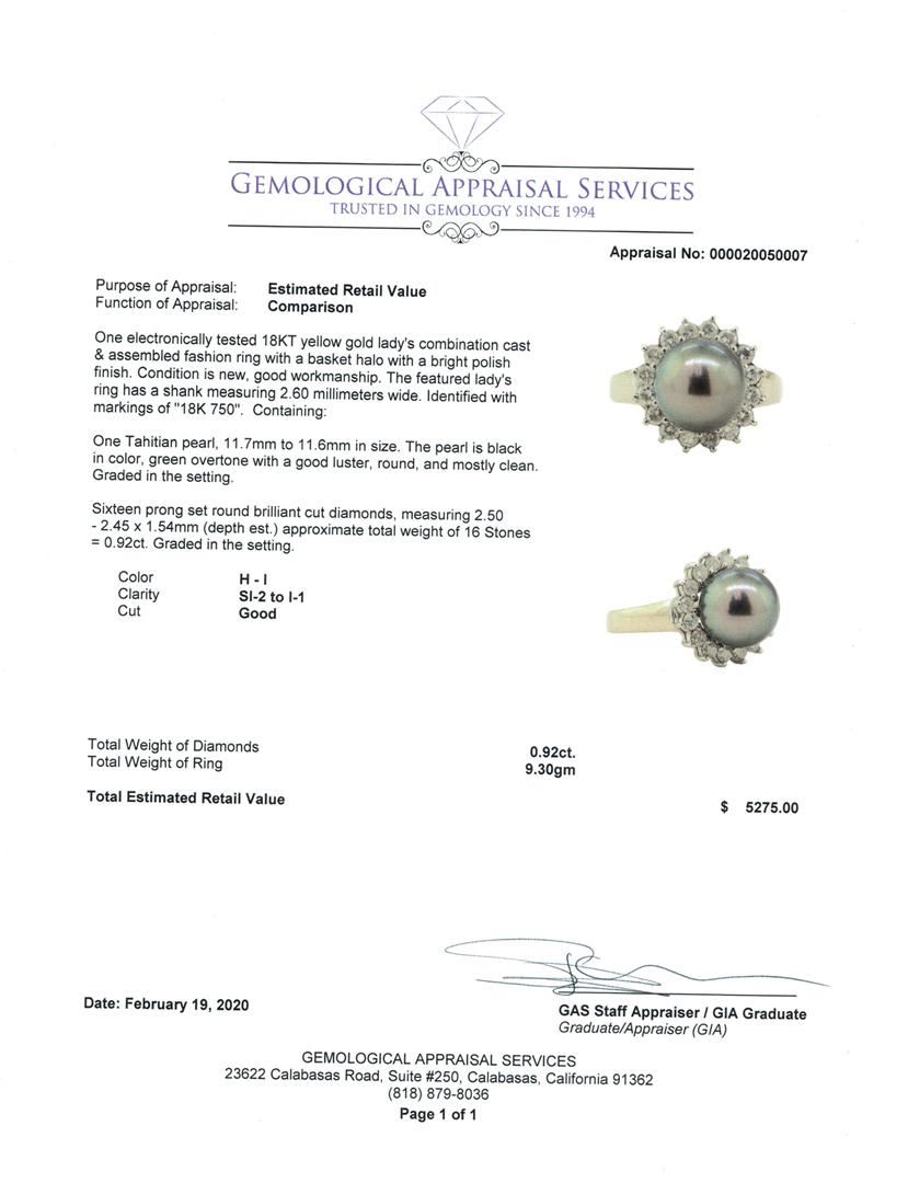 One electronically tested 18KT yellow gold lady's combination cast & assembled fashion ring with a basket halo with a bright polish finish. The featured lady's ring has a shank measuring 2.60 millimeters wide. Identified with markings of '18K 750'. Condition is new, good workmanship. Containing: One Tahitian pearl, 11.7mm to 11.6mm in size. The pearl is black in color, green overtone with a good luster, round, and mostly clean. Graded in the setting. Sixteen prong set round brilliant cut diamonds, measuring 2.50 - 2.45 x 1.54mm (depth est.) approximate total weight of 16 Stones = 0.92ct. Graded in the setting. Color H - I Clarity SI-2 to I-1 Cut Good. Total Weight of Diamonds 0.92ct.. Total Weight of Ring 9.30gm GAS Appraised at $5275.00. GAS Appraised at $5,275.00.