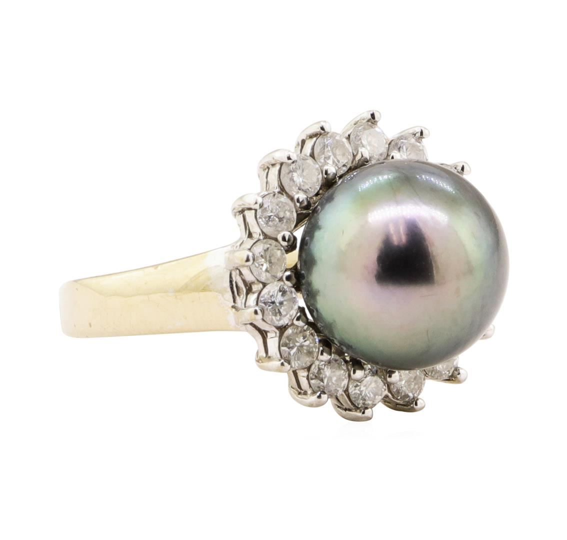 One electronically tested 18KT yellow gold lady's combination cast & assembled fashion ring with a basket halo with a bright polish finish. The featured lady's ring has a shank measuring 2.60 millimeters wide. Identified with markings of '18K 750'. Condition is new, good workmanship. Containing: One Tahitian pearl, 11.7mm to 11.6mm in size. The pearl is black in color, green overtone with a good luster, round, and mostly clean. Graded in the setting. Sixteen prong set round brilliant cut diamonds, measuring 2.50 - 2.45 x 1.54mm (depth est.) approximate total weight of 16 Stones = 0.92ct. Graded in the setting. Color H - I Clarity SI-2 to I-1 Cut Good. Total Weight of Diamonds 0.92ct.. Total Weight of Ring 9.30gm GAS Appraised at $5275.00. GAS Appraised.