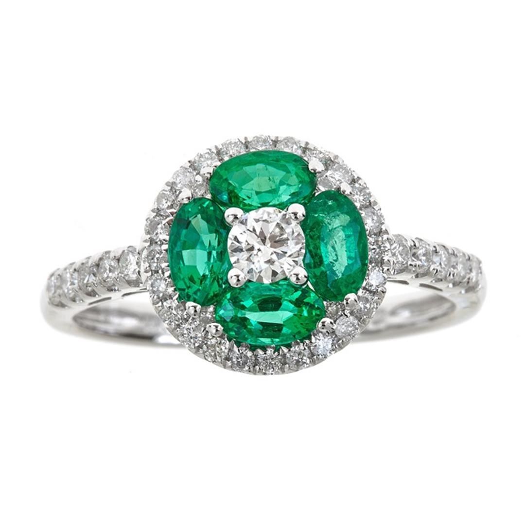One Emerald and Diamond Ring featuring: 14KT White Gold weighing a total of 2.74 grams, Four Emeralds with a total weight of 0.92ct, and 39 Diamonds with a total weight of 0.48ctw.
