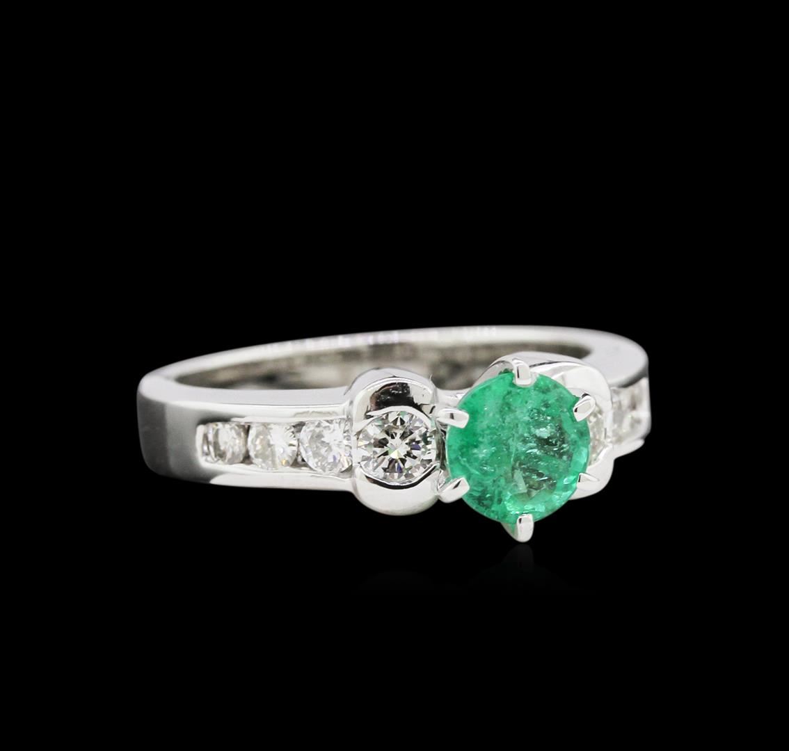 One electronically tested platinum ladies cast & assembled emerald and diamond ring with a bright polish finish. The featured emerald is supported by diamond set shoulders, completed by a three millimeter wide band. Identified with markings of "PLAT 950". Condition is new, good workmanship. Containing: One prong set round mixed cut natural emerald, measuring 6.20 - 6.10 x 3.80 mm, 8%. bulge factor, approximate weight of 0.92ct., clarity is moderately included, type III, medium, moderately strong, very slightly bluish green color, (GIA vslbG 5/4), cut is good. Transmitting light somewhat diffusely, transparent to translucent. Naturally occurring internal & external characteristics are present. Indications of oil residue. Graded in the setting. Two half bezel set round brilliant cut diamonds, measuring 3.20 - 3.10 x 1.89mm (depth est.) approximate total weight of 2 Stones = 0.24ct. Graded in the setting. Clarity: SI-1 to SI-2. Color: H Six channel set round brilliant cut diamonds, measuring 2.40 - 2.30 x 1.41mm (depth est.) approximate total weight of 6 Stones = 0.30ct. Graded in the setting. Clarity: SI-1 to I-1. Color: G - I. Total Weight of Colored Stones 0.92ct. Total Weight of Diamonds 0.54ct. Total Weight of Ring 10.22gm. AIG Appraised at $4,695.00.