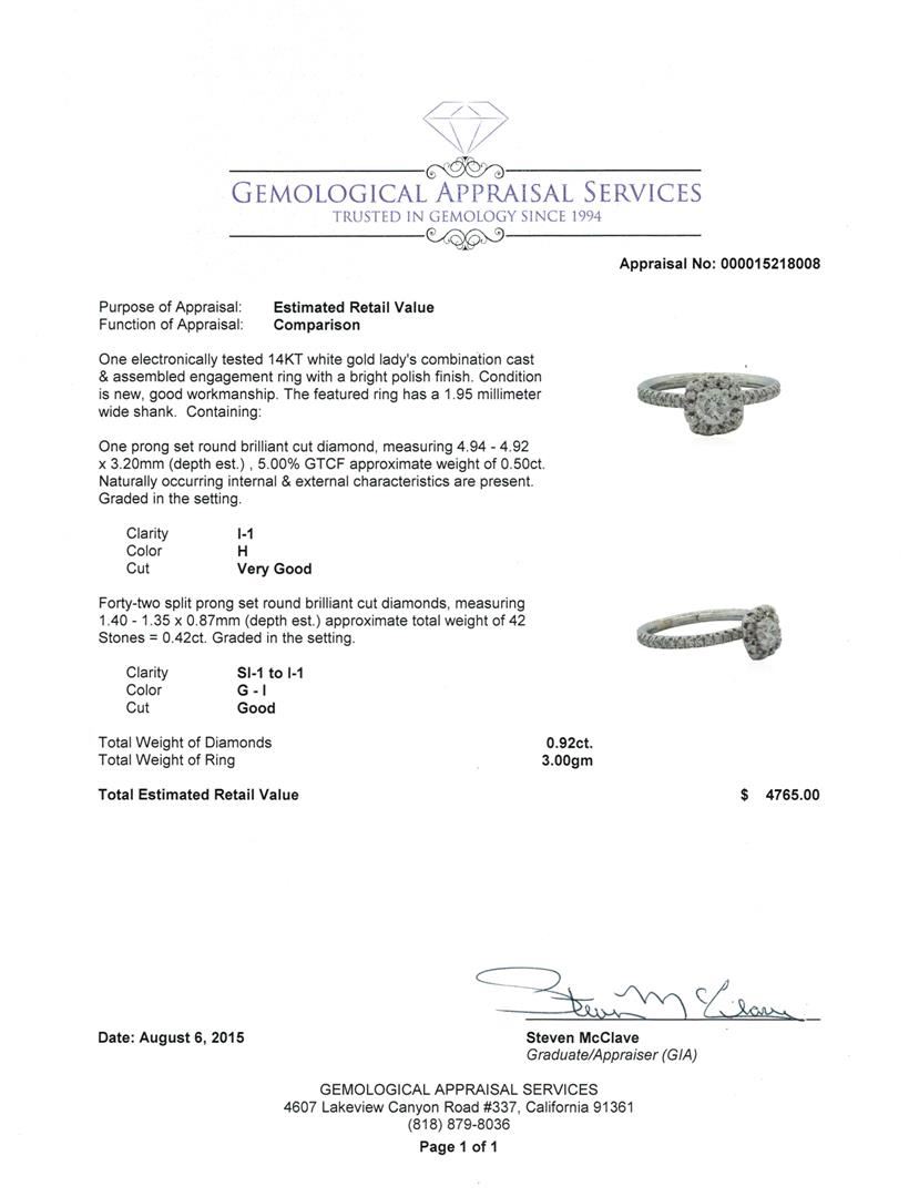 One electronically tested 14KT white gold lady's combination cast & assembled engagement ring with a bright polish finish. The featured ring has a 1.95 millimeter wide shank. Condition is new, good workmanship. Containing: One prong set round brilliant cut diamond, measuring 4.94 - 4.92 x 3.20mm (depth est.) , 5.00.%. GTCF approximate weight of 0.50ct. Naturally occurring internal & external characteristics are present. Graded in the setting. Clarity: I-1. Color: Very Good Forty-Two split prong set round brilliant cut diamonds, measuring 1.40 - 1.35 x 0.87mm (depth est.) approximate. Total Weight of 42 Stones = 0.42ct. Graded in the setting. Clarity: SI-1 to I-1. Color: G - I. Cut Good. Total Weight of Diamonds 0.92ct. Total Weight of Ring 3.00gm. GAS Appraised at $4,765.00.