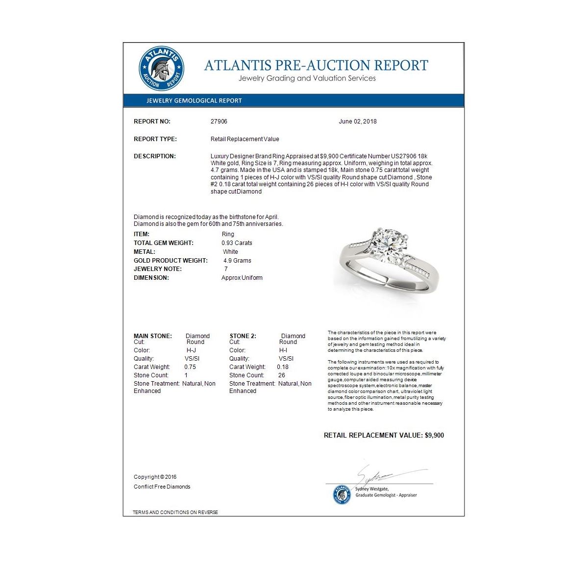 REF-180M2H -27906 ---- 0.93 CTW Certified VS/SI Diamond Solitaire Ring 18K White Gold ---- Luxury Designer Brand Ring Appraised at $9,900 Certificate Number US27906 18k White gold, Ring Size is 7, Ring measuring approx. Uniform, weighing in total approx. 4.7 grams. Made in the USA and is stamped 18k, Main stone 0.75 carat total weight containing 1 pieces of H-J color with VS/SI quality Round shape cut Diamond , Stone #2 0.18 carat total weight containing 26 pieces of H-I color with VS/SI quality Round shape cut Diamond