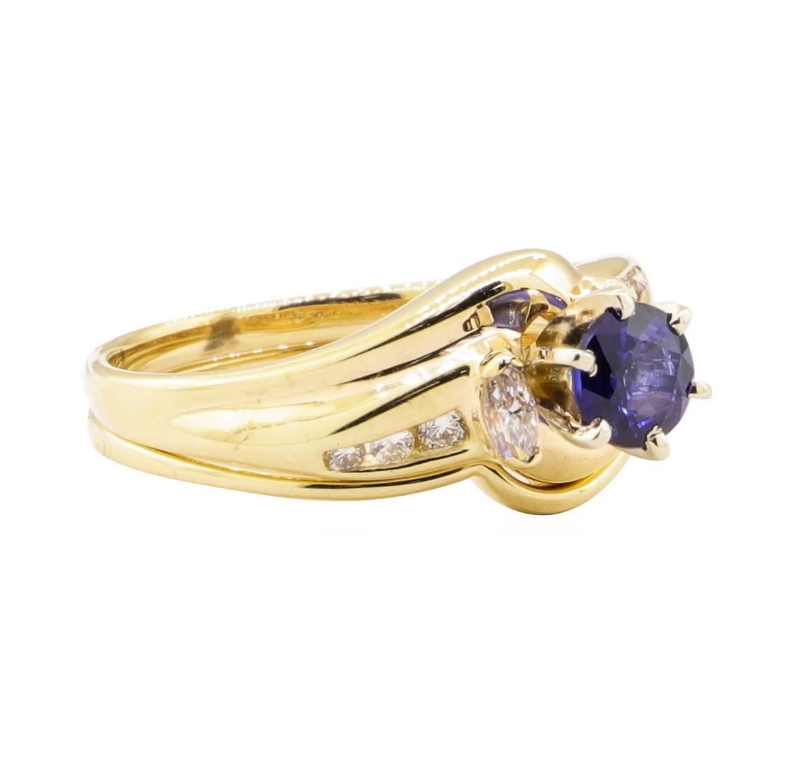 One ring set featuring: 14KT yellow gold weighing 4.0 grams containing one blue sapphire weighing 0.58ctw and diamonds weighing 0.35ctw.