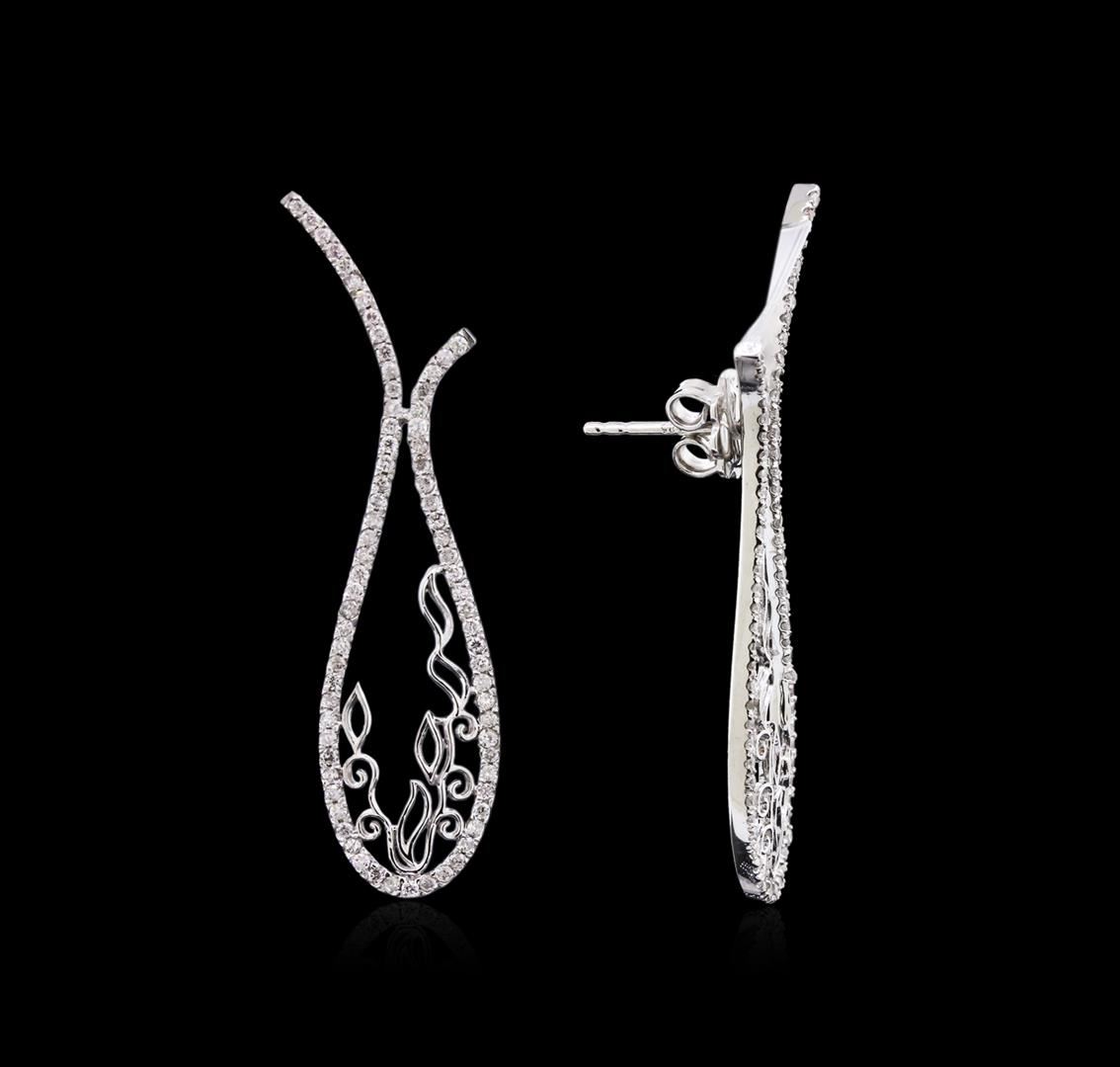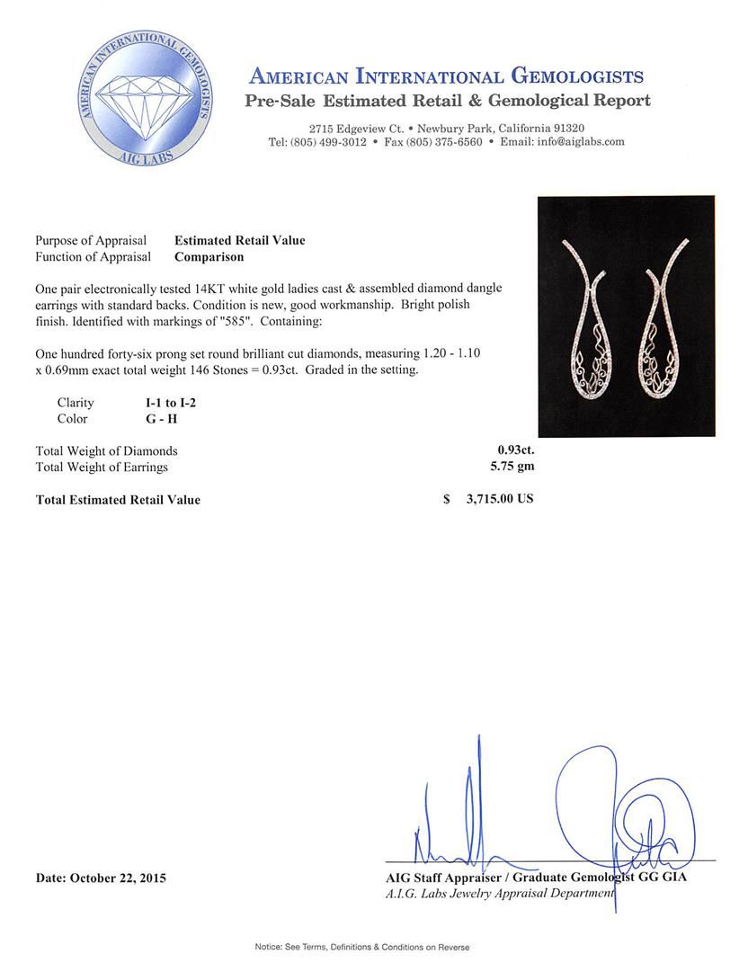 One pair electronically tested 14KT white gold ladies cast & assembled diamond dangle earrings with standard backs. Bright polish finish. Identified with markings of "585". Condition is new, good workmanship. Containing: One Hundred Forty-Six prong set round brilliant cut diamonds, measuring 1.20 - 1.10 x 0.69mm exact total weight 146 Stones = 0.93ct. Graded in the setting. Clarity: I-1 to I-2. Color: G - H. Total Weight of Diamonds 0.93ct. Total Weight of Earrings 5.75gm. AIG Appraised at $3,715.00.