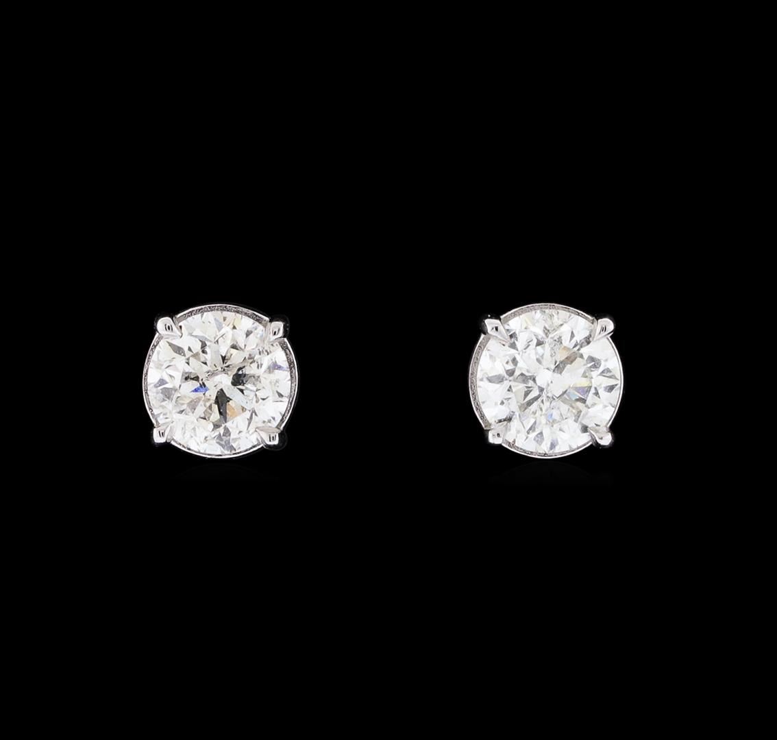 One pair electronically tested 14KT white gold lady's cast stud earrings with friction posts with a basket setting with a bright polish finish. Identified with markings of '14K'. Condition is new, good workmanship. Containing: One prong set round brilliant cut diamond, measuring 4.80 - 4.78 x 3.30mm (depth est.) approximate weight of 0.47ct. Graded in the setting. Clarity I-1. Color: H - I Cut Good One prong set round brilliant cut diamond, measuring 4.76 - 4.75 x 3.20mm (depth est.) approximate weight of 0.46ct. Graded in the setting. Clarity I-1. Color: I - J Cut Good. Total Weight of Diamonds 0.93ct.. Total Weight of Earrings 1.00gm. GAS Appraised at $4,135.00.