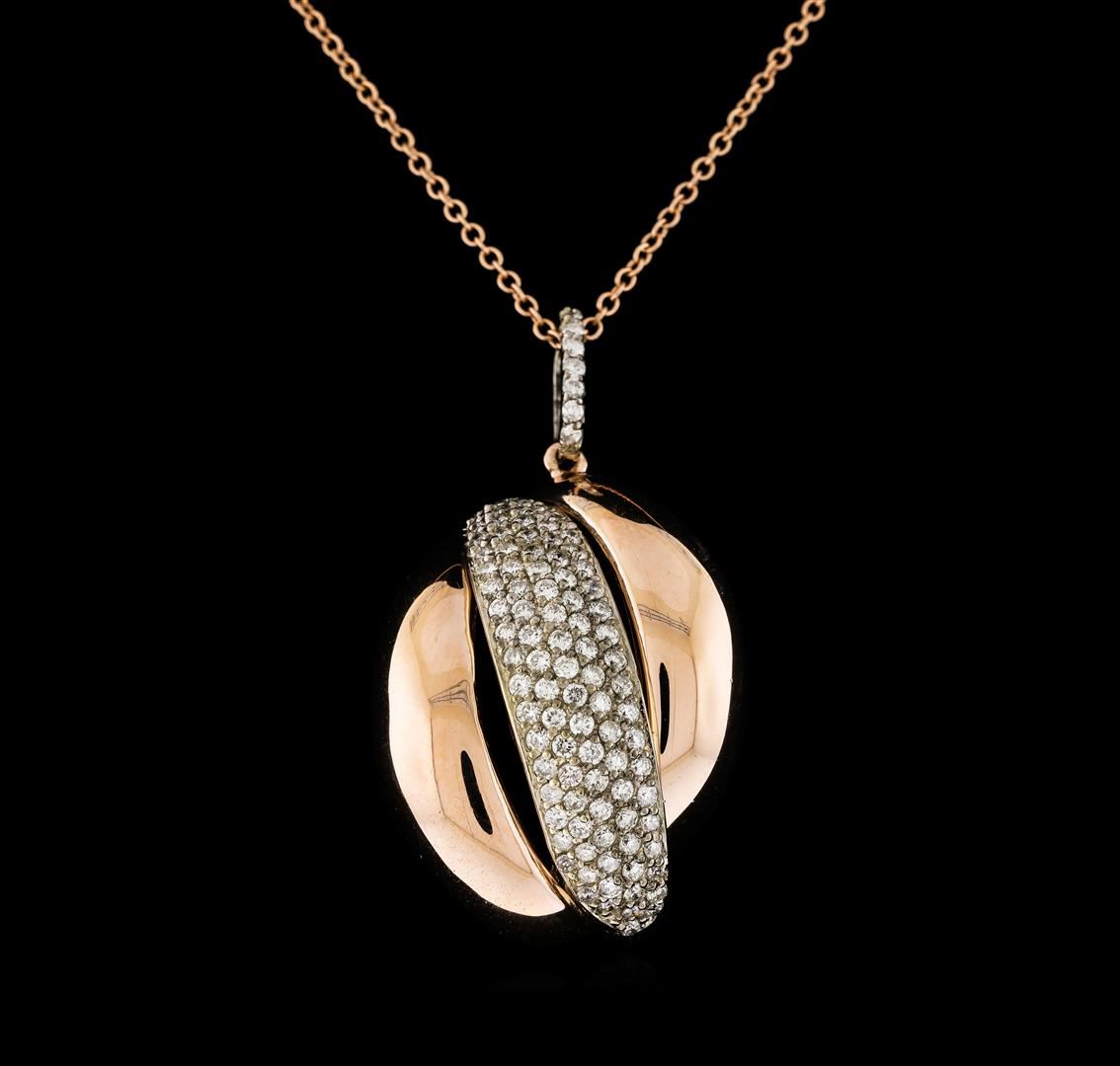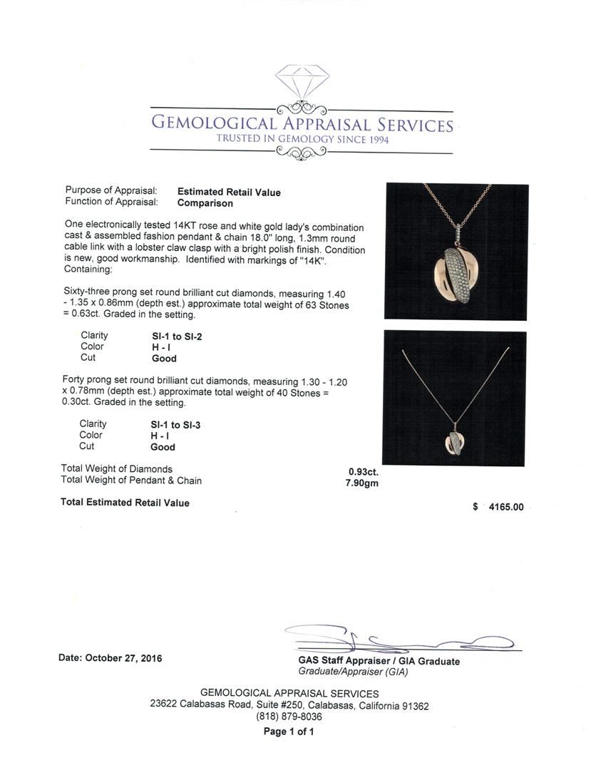 One electronically tested 14KT rose and white gold lady's combination cast & assembled fashion pendant & chain 18.0' long, 1.3mm round cable link with a lobster claw clasp with a bright polish finish. Identified with markings of '14K'. Condition is new, good workmanship. Containing: Sixty-Three prong set round brilliant cut diamonds, measuring 1.40 - 1.35 x 0.86mm (depth est.) approximate total weight of 63 Stones = 0.63ct. Graded in the setting. Clarity SI-1 to SI-2. Color: H - I Cut Good Forty prong set round brilliant cut diamonds, measuring 1.30 - 1.20 x 0.78mm (depth est.) approximate total weight of 40 Stones = 0.30ct. Graded in the setting. Clarity SI-1 to SI-3. Color: H - I Cut Good. Total Weight of Diamonds 0.93ct.. Total Weight of Pendant & Chain 7.90gm. GAS Appraised at $4,165.00.