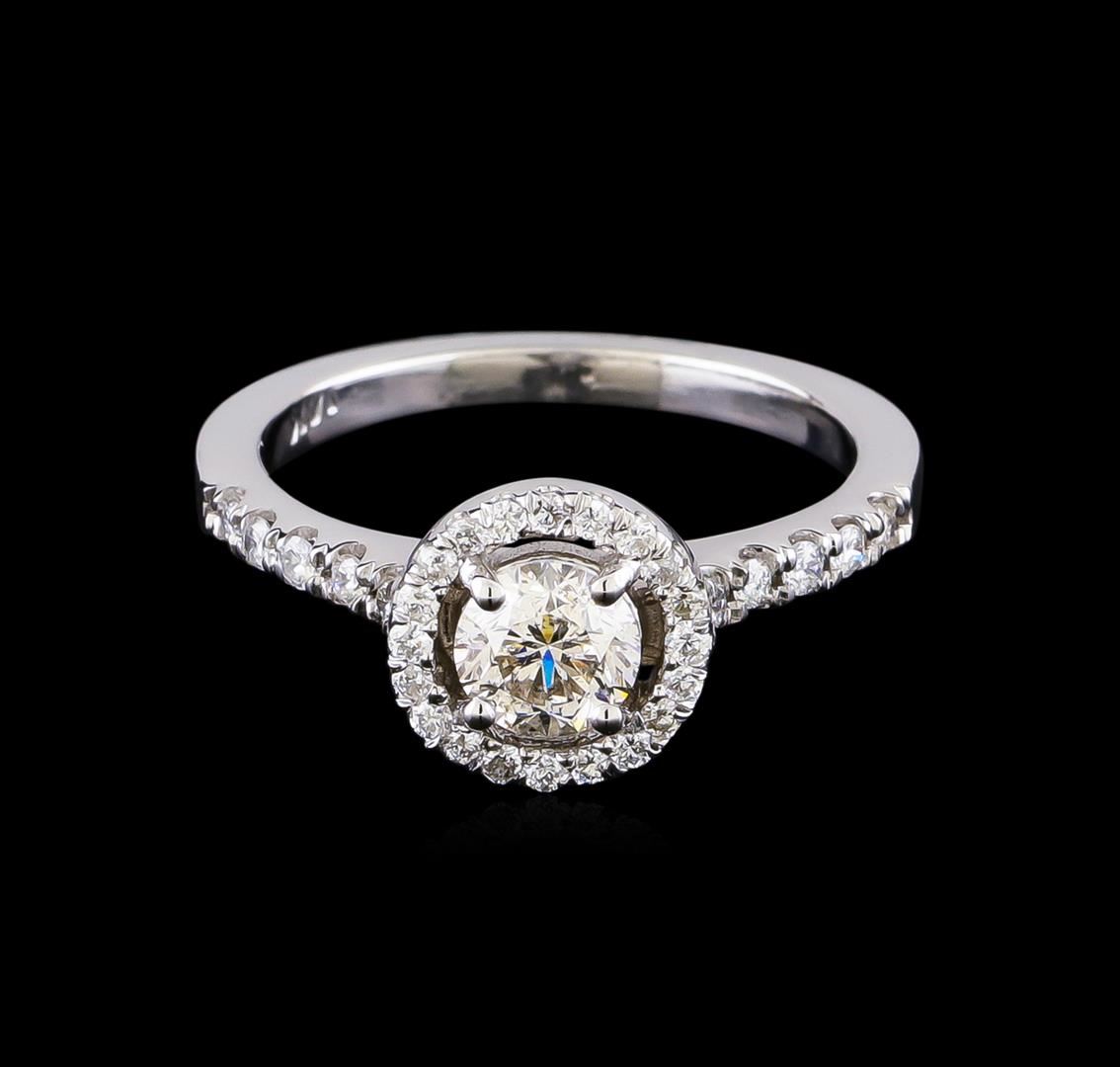One electronically tested 14KT white gold lady's cast wedding ring with a halo with a bright polish finish. The featured lady's ring has a shank measuring 1.97 millimeters in width. Identified with markings of "14K". Condition is new, good workmanship. Containing: One prong set round brilliant cut diamond, measuring 5.17 - 5.10 x 3.65mm (depth est.) , 5.00.%. GTCF approximate weight of 0.63ct. Graded in the setting. Clarity: I-1. Color: I - Very Good Ten prong set round brilliant cut diamonds, measuring 1.65 - 1.55 x 0.99mm (depth est.) approximate total weight of 10 Stones = 0.15ct. Graded in the setting. Clarity: SI-1 to SI-2. Color: H - I. Cut Good Twenty prong set round brilliant cut diamonds, measuring 1.30 - 1.20 x 0.75mm (depth est.) approximate total weight of 20 Stones = 0.15ct. Graded in the setting. Clarity: SI-1 to I-1. Color: H - I. Cut Good. Total Weight of Diamonds 0.93ct. Total Weight of Ring 3.30gm GAS Appraised at $4,560.00.