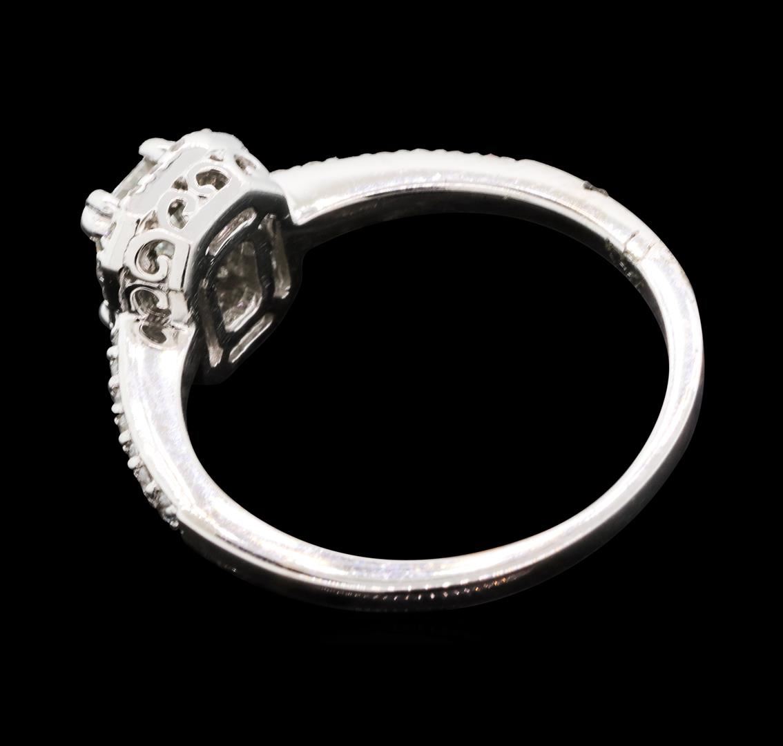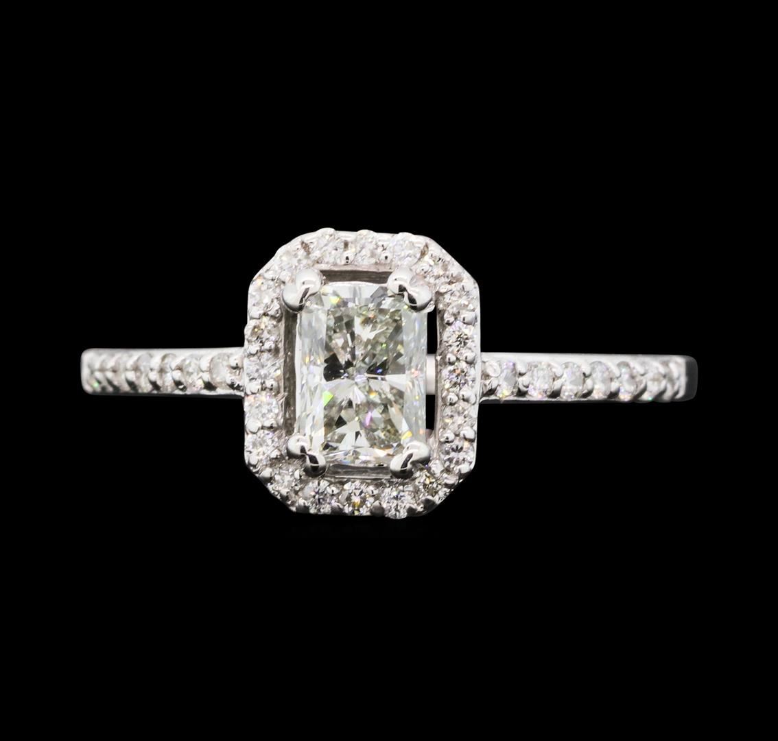 One electronically tested 14KT white gold lady's cast wedding ring with a cathedral halo with a bright polish finish. The featured lady's ring has a shank measuring 1.36 millimeters wide. Identified with markings of '14K'. Condition is new, good workmanship. Containing: One prong set radiant shaped cut diamond, measuring 5.65 x 3.97 x 3.51mm (depth est.) , 10.00.%. GTCF approximate weight of 0.71ct. Graded in the setting. Color H Clarity VS-2 Cut Good Thirty-Four prong set round brilliant cut diamonds, measuring 1.25 - 1.15 x 0.74mm (depth est.) approximate total weight of 34 Stones = 0.22ct. Graded in the setting. Color G - H Clarity SI-1 to I-1 Cut Good. Total Weight of Diamonds 0.93ct.. Total Weight of Ring 2.70gm GAS Appraised at $7,700.00.