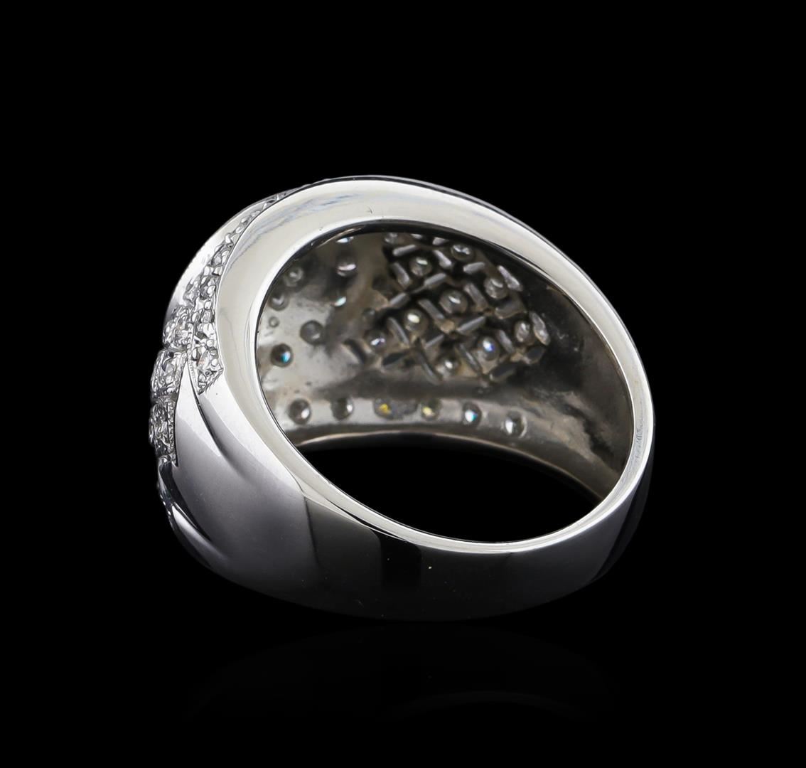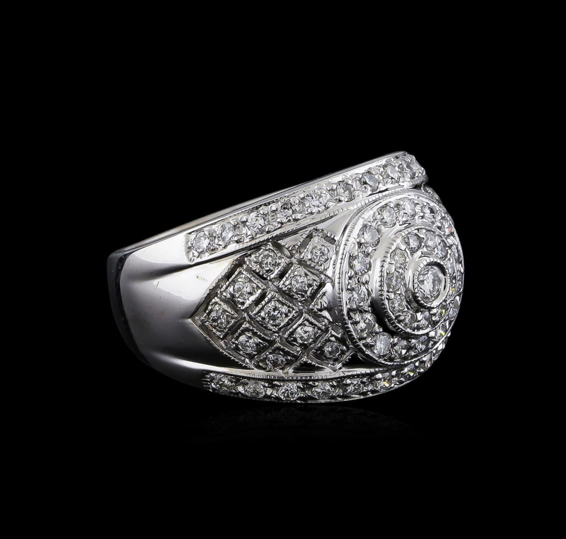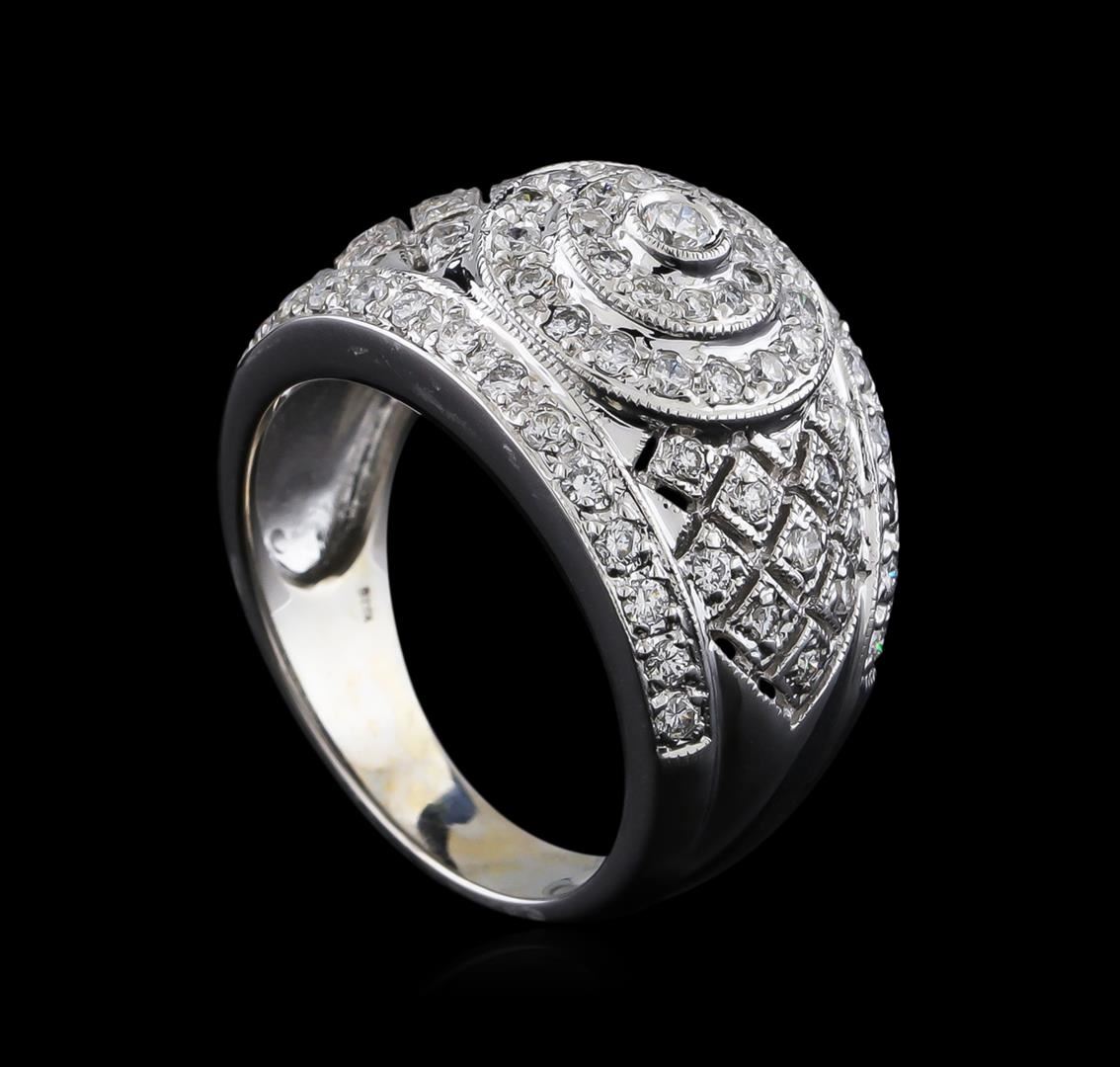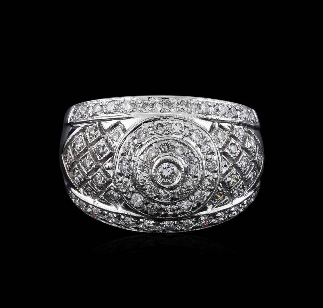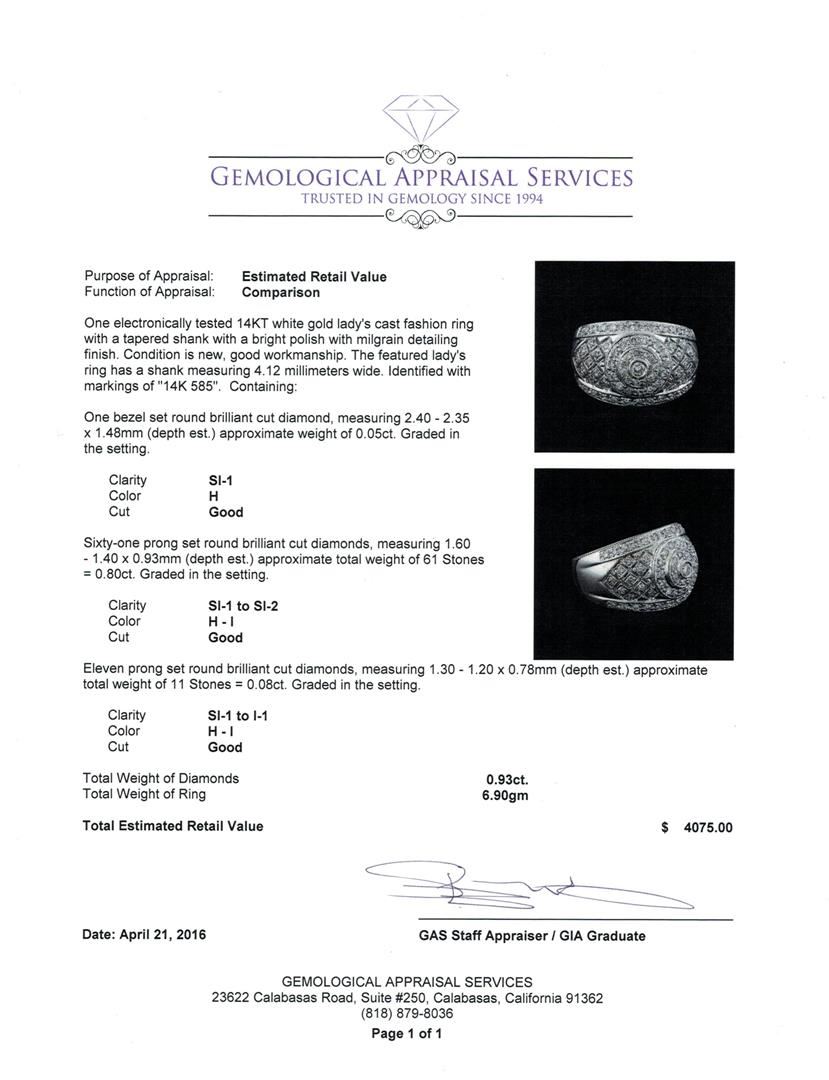 One electronically tested 14KT white gold lady's cast fashion ring with a tapered shank with a bright polish with milgrain detailing finish. The featured lady's ring has a shank measuring 4.12 millimeters wide. Identified with markings of "14K 585". Condition is new, good workmanship. Containing: One bezel set round brilliant cut diamond, measuring 2.40 - 2.35 x 1.48mm (depth est.) approximate weight of 0.05ct. Graded in the setting. Clarity: SI-1. Color: Good Sixty-One prong set round brilliant cut diamonds, measuring 1.60 - 1.40 x 0.93mm (depth est.) approximate total weight of 61 Stones = 0.80ct. Graded in the setting. Clarity: SI-1 to SI-2. Color: H - I. Cut Good Eleven prong set round brilliant cut diamonds, measuring 1.30 - 1.20 x 0.78mm (depth est.) approximate total weight of 11 Stones = 0.08ct. Graded in the setting. Clarity: SI-1 to I-1. Color: H - I. Cut Good. Total Weight of Diamonds 0.93ct. Total Weight of Ring 6.90gm. GAS Appraised at $4,075.00.
