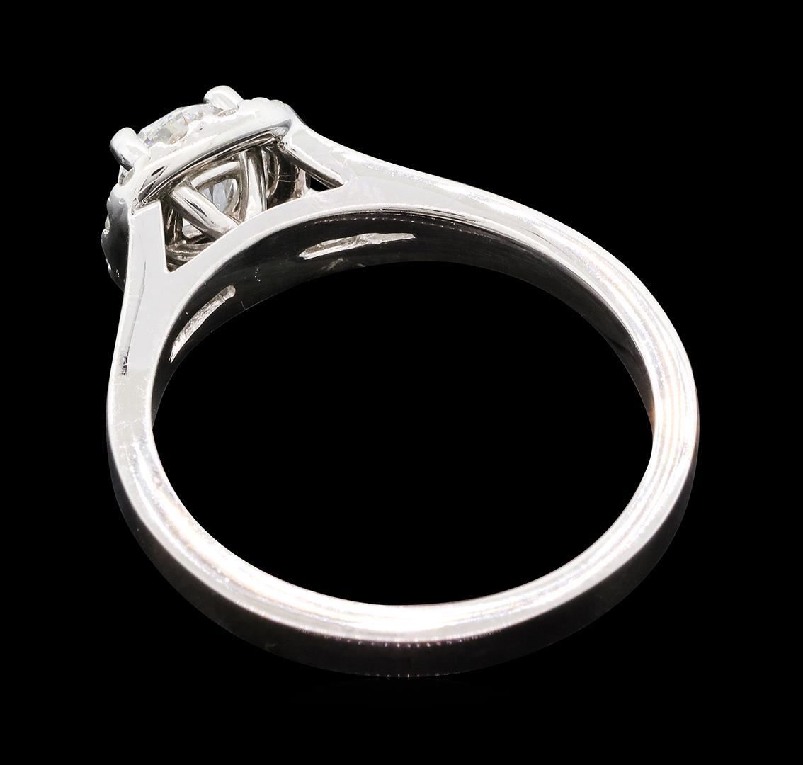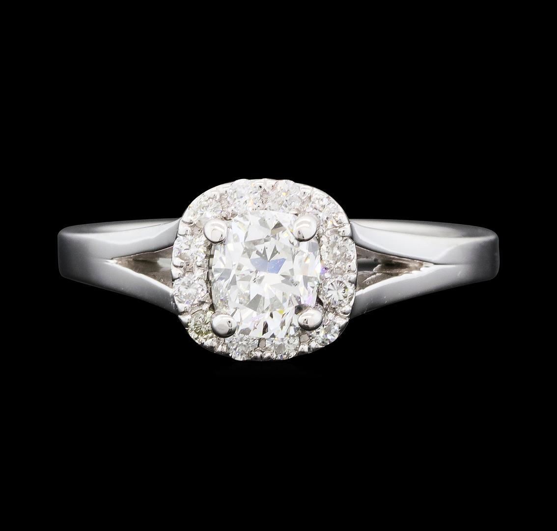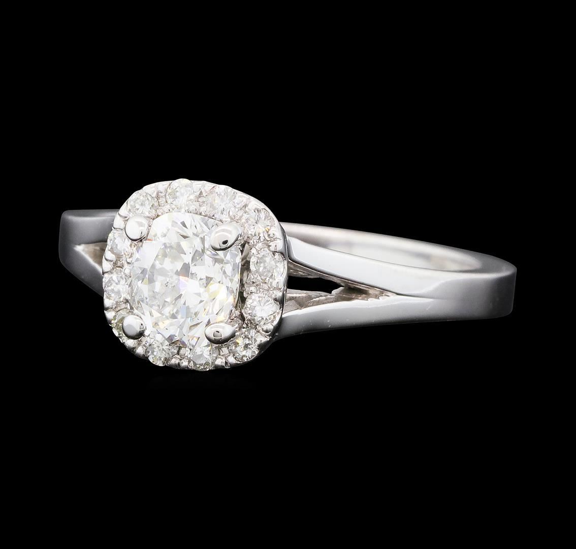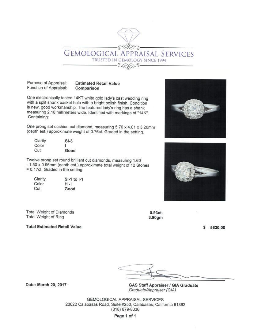 One electronically tested 14KT white gold lady's cast wedding ring with a split shank basket halo with a bright polish finish. The featured lady's ring has a shank measuring 2.18 millimeters wide. Identified with markings of '14K'. Condition is new, good workmanship. Containing: One prong set cushion cut diamond, measuring 5.70 x 4.81 x 3.20mm (depth est.) approximate weight of 0.76ct. Graded in the setting. Color I Clarity SI-3 Cut Good Twelve prong set round brilliant cut diamonds, measuring 1.60 - 1.50 x 0.96mm (depth est.) approximate total weight of 12 Stones = 0.17ct. Graded in the setting. Color H - I Clarity SI-1 to I-1 Cut Good. Total Weight of Diamonds 0.93ct.. Total Weight of Ring 3.90gm GAS Appraised.