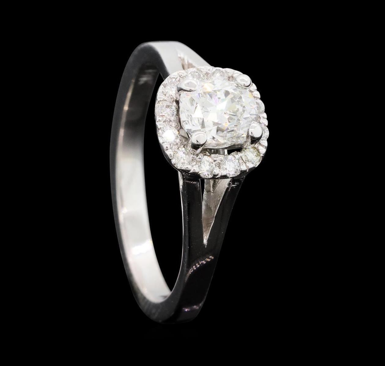 One electronically tested 14KT white gold lady's cast wedding ring with a split shank basket halo with a bright polish finish. The featured lady's ring has a shank measuring 2.18 millimeters wide. Identified with markings of '14K'. Condition is new, good workmanship. Containing: One prong set cushion cut diamond, measuring 5.70 x 4.81 x 3.20mm (depth est.) approximate weight of 0.76ct. Graded in the setting. Color I Clarity SI-3 Cut Good Twelve prong set round brilliant cut diamonds, measuring 1.60 - 1.50 x 0.96mm (depth est.) approximate total weight of 12 Stones = 0.17ct. Graded in the setting. Color H - I Clarity SI-1 to I-1 Cut Good. Total Weight of Diamonds 0.93ct.. Total Weight of Ring 3.90gm GAS Appraised.