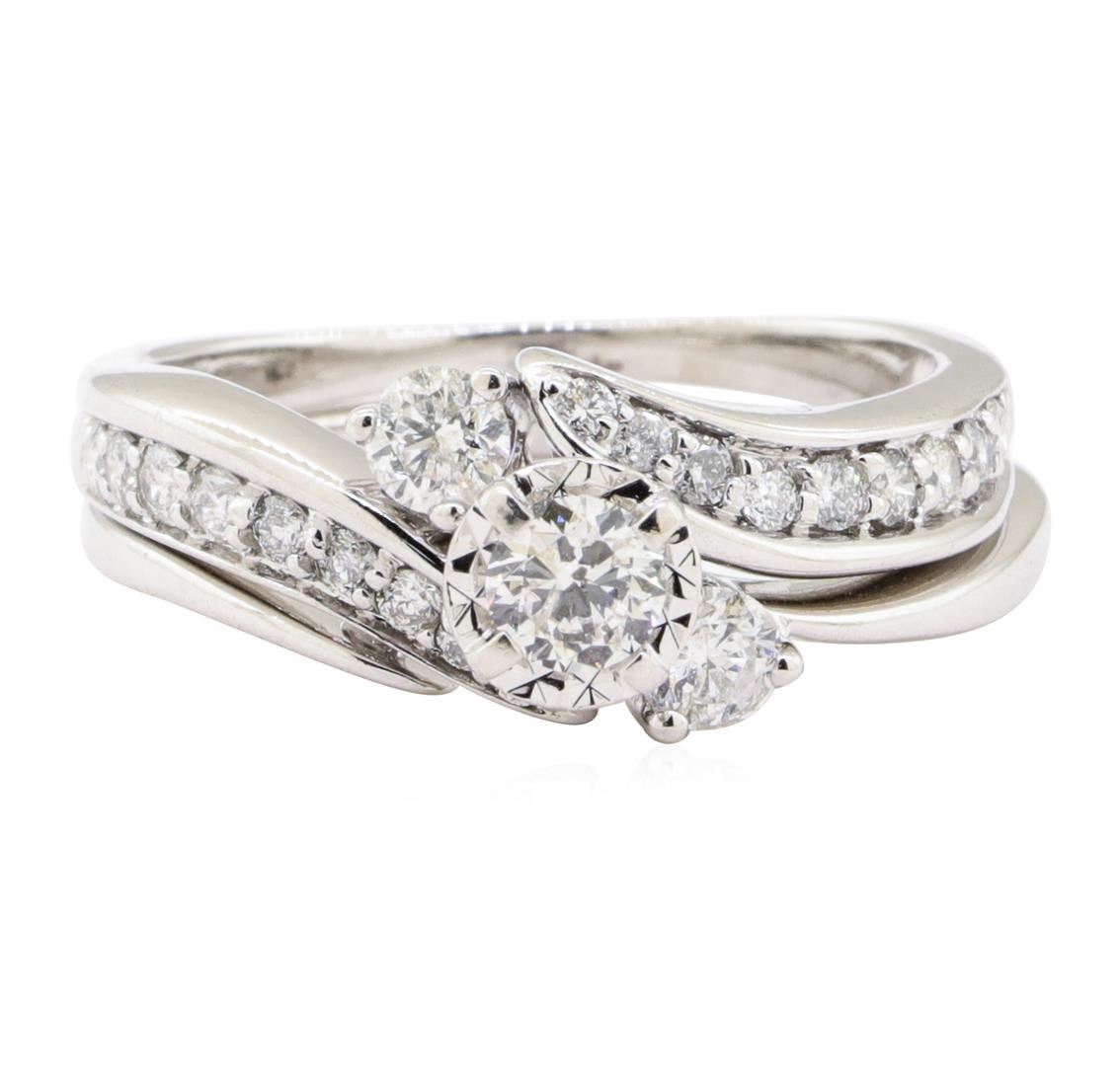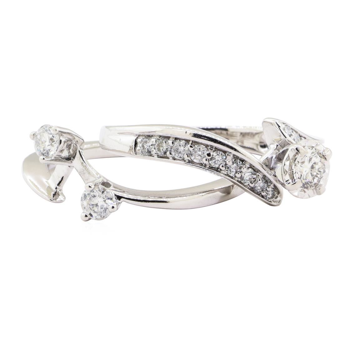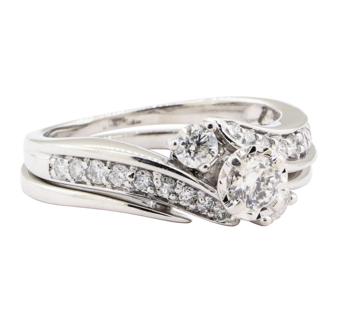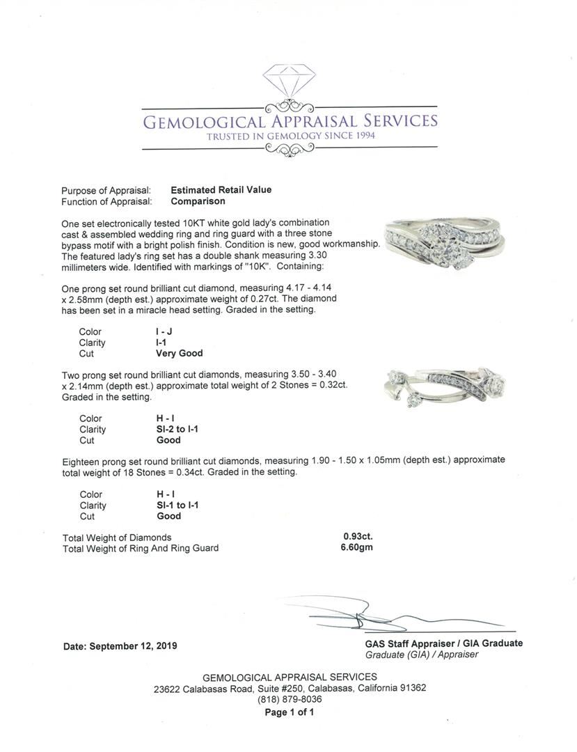 One set electronically tested 10KT white gold lady's combination cast & assembled wedding ring and ring guard with a three stone bypass motif with a bright polish finish. The featured lady's ring set has a double shank measuring 3.30 millimeters wide. Identified with markings of '10K'. Condition is new, good workmanship. Containing: One prong set round brilliant cut diamond, measuring 4.17 - 4.14 x 2.58mm (depth est.) approximate weight of 0.27ct. The diamond has been set in a miracle head setting. Graded in the setting. Color I - J Clarity I-1 Cut Very Good Two prong set round brilliant cut diamonds, measuring 3.50 - 3.40 x 2.14mm (depth est.) approximate total weight of 2 Stones = 0.32ct. Graded in the setting. Color H - I Clarity SI-2 to I-1 Cut Good Eighteen prong set round brilliant cut diamonds, measuring 1.90 - 1.50 x 1.05mm (depth est.) approximate total weight of 18 Stones = 0.34ct. Graded in the setting. Color H - I Clarity SI-1 to I-1 Cut Good. Total Weight of Diamonds 0.93ct.. Total Weight of Ring And Ring Guard 6.60gm GAS Appraised at $2840.00. GAS Appraised.