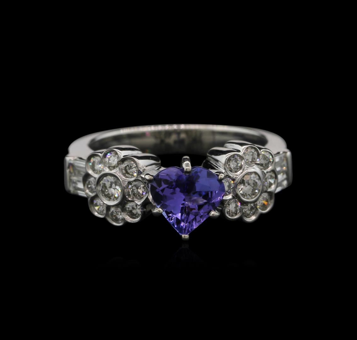 One ring featuring: 18KT white gold weighing 7.01 grams containing one prong set heart shape tanzanite center stone with a total weight of 0.93ct and bezel set round cut and channel set baguette cut diamonds with a total weight of 0.68ct.