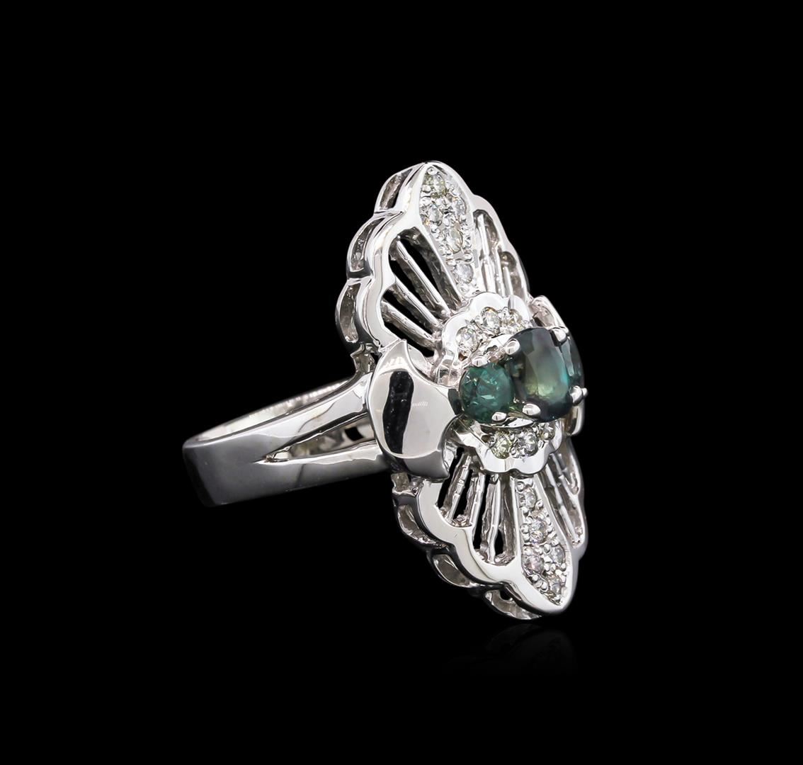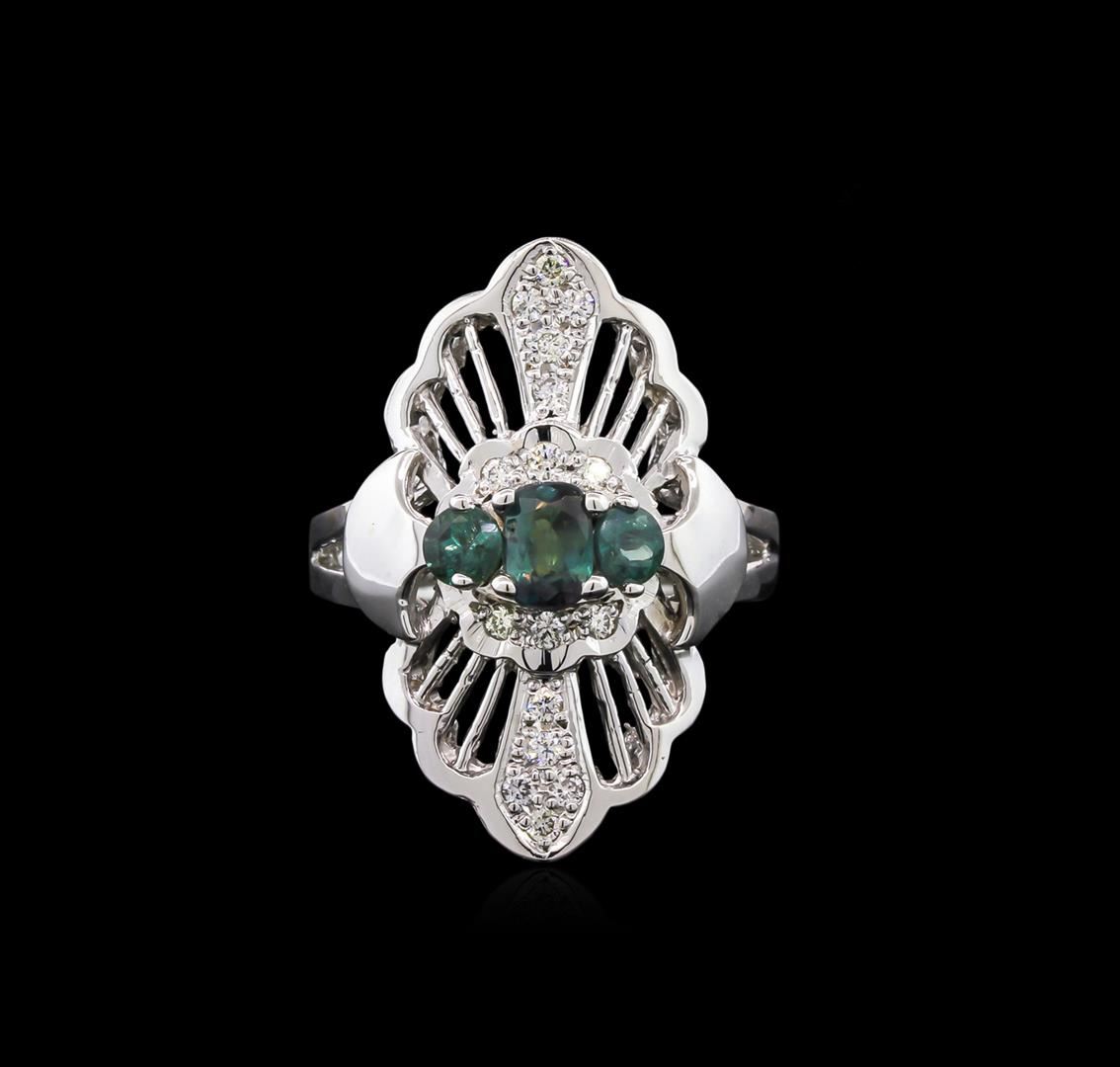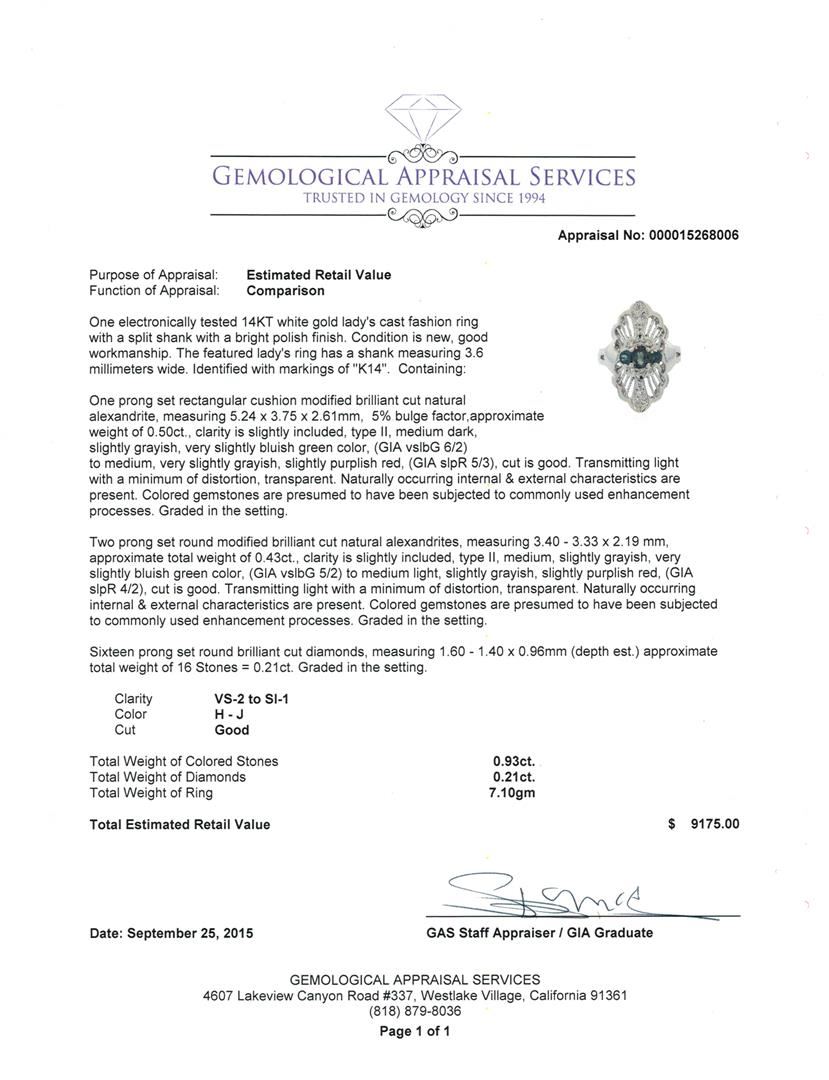 One electronically tested 14KT white gold lady's cast fashion ring with a split shank with a bright polish finish. The featured lady's ring has a shank measuring 3.6 millimeters wide. Identified with markings of "K14". Condition is new, good workmanship. Containing: One prong set rectangular cushion modified brilliant cut natural alexandrite, measuring 5.24 x 3.75 x 2.61mm, 5% bulge factor, approximate weight of 0.50ct., clarity is slightly included, type II, medium dark, slightly grayish, very slightly bluish green color, (GIA vslbG 6/2) to medium, very slightly grayish, slightly purplish red, (GIA slpR 5/3), cut is good. Transmitting light with a minimum of distortion, transparent. Naturally occurring internal & external characteristics are present. Colored gemstones are presumed to have been subjected to commonly used enhancement processes. Graded in the setting. Two prong set round modified brilliant cut natural alexandrites, measuring 3.40 - 3.33 x 2.19 mm, approximate total weight of 0.43ct., clarity is slightly included, type II, medium, slightly grayish, very slightly bluish green color, (GIA vslbG 5/2) to medium light, slightly grayish, slightly purplish red, (GIA slpR 4/2), cut is good. Transmitting light with a minimum of distortion, transparent. Naturally occurring internal & external characteristics are present. Colored gemstones are presumed to have been subjected to commonly used enhancement processes. Graded in the setting. Sixteen prong set round brilliant cut diamonds, measuring 1.60 - 1.40 x 0.96mm (depth est.) approximate total weight of 16 Stones = 0.21ct. Graded in the setting. Clarity: VS-2 to SI-1. Color: H - Good. Total Weight of Colored Stones 0.93ct. Total Weight of Diamonds 0.21ct. Total Weight of Ring 7.10gm at $9175.00.. GAS Appraised at $9,175.00.