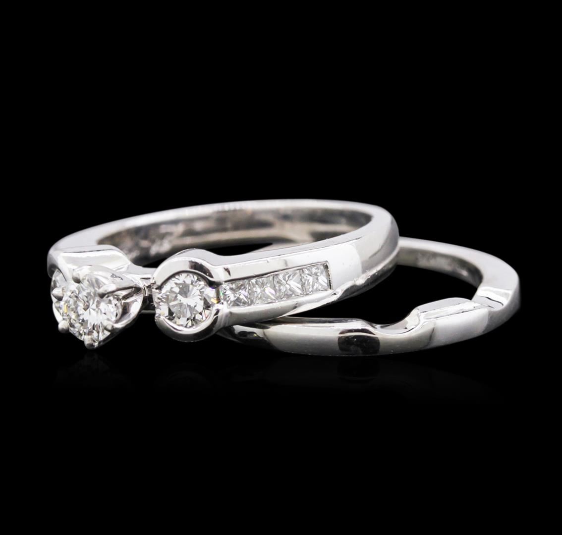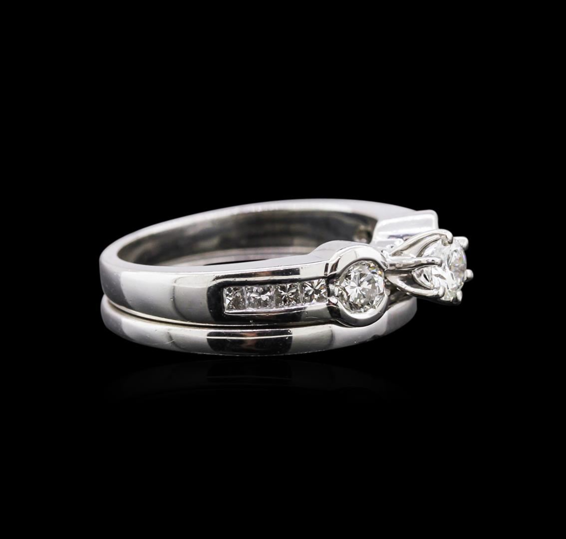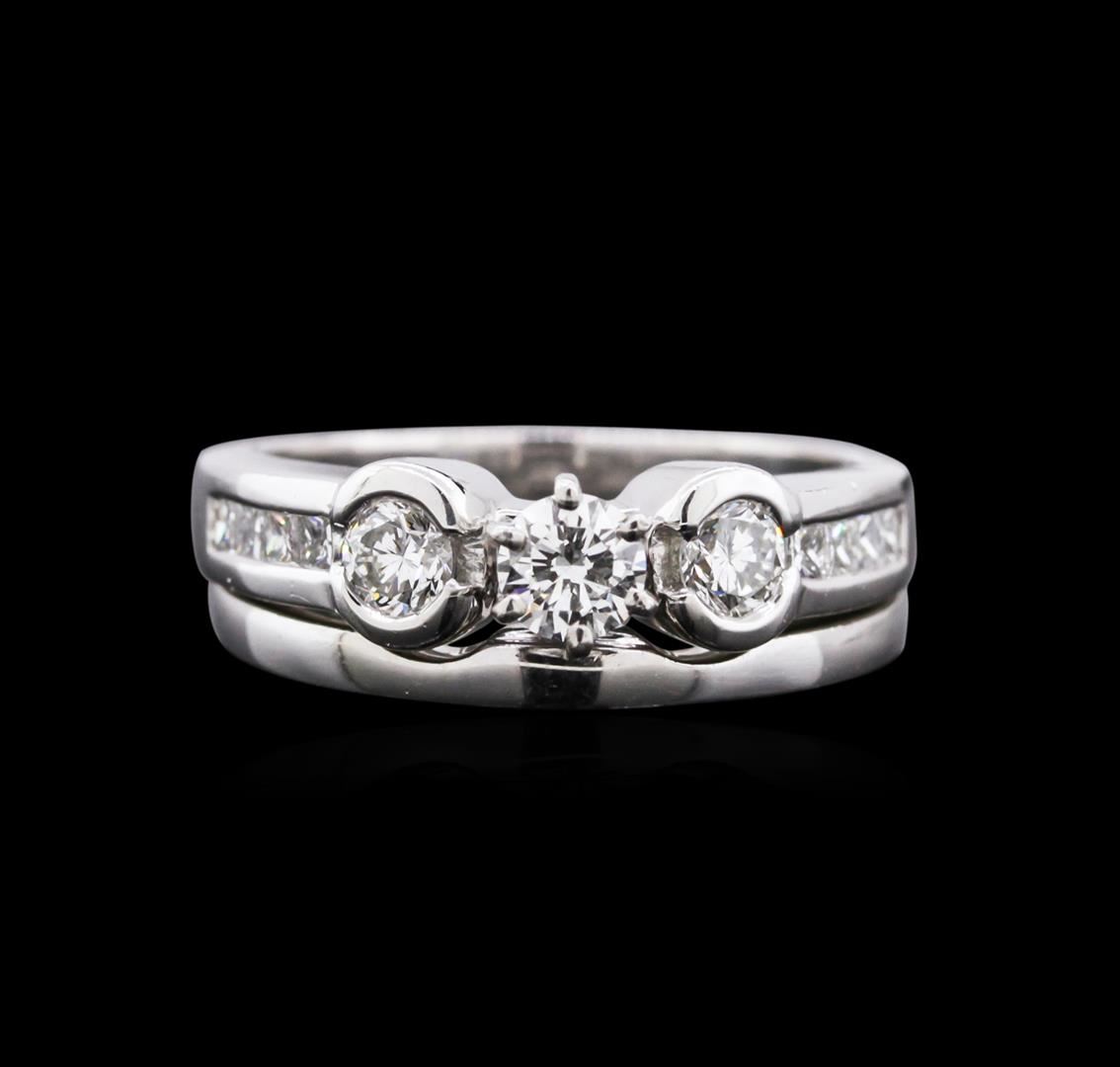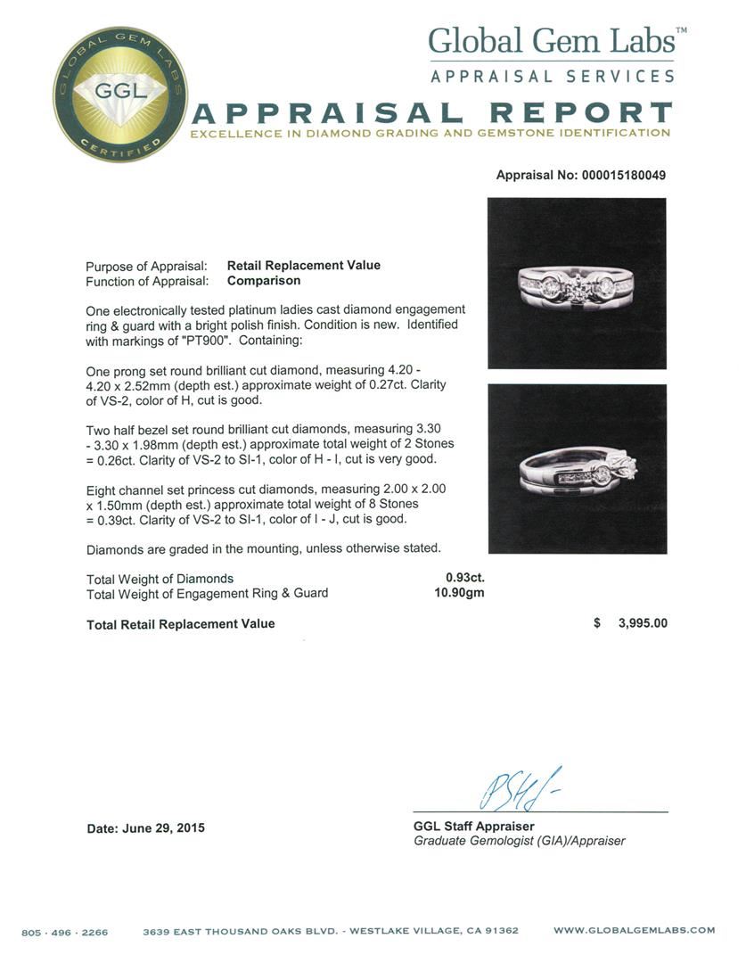 One electronically tested platinum ladies cast diamond engagement ring & guard with a bright polish finish. Identified with markings of "PT900". Condition is new. Containing: One prong set round brilliant cut diamond, measuring 4.20 - 4.20 x 2.52mm (depth est.) approximate weight of 0.27ct. Clarity: VS-2. Color: H, Cut is Good. Two half bezel set round brilliant cut diamonds, measuring 3.30 - 3.30 x 1.98mm (depth est.) approximate. Total Weight of 2 Stones = 0.26ct. Clarity: VS-2 to SI-1. Color: H - I, Cut is Very Good. Eight channel set princess cut diamonds, measuring 2.00 x 2.00 x 1.50mm (depth est.) approximate. Total Weight of 8 Stones = 0.39ct. Clarity: VS-2 to SI-1. Color: I - J, Cut is Good. Diamonds are graded in the mounting, unless otherwise stated. Total Weight of Diamonds 0.93ct. Total Weight of Engagement Ring & Guard 10.90 grams. GGL Appraised at $3,995.00.