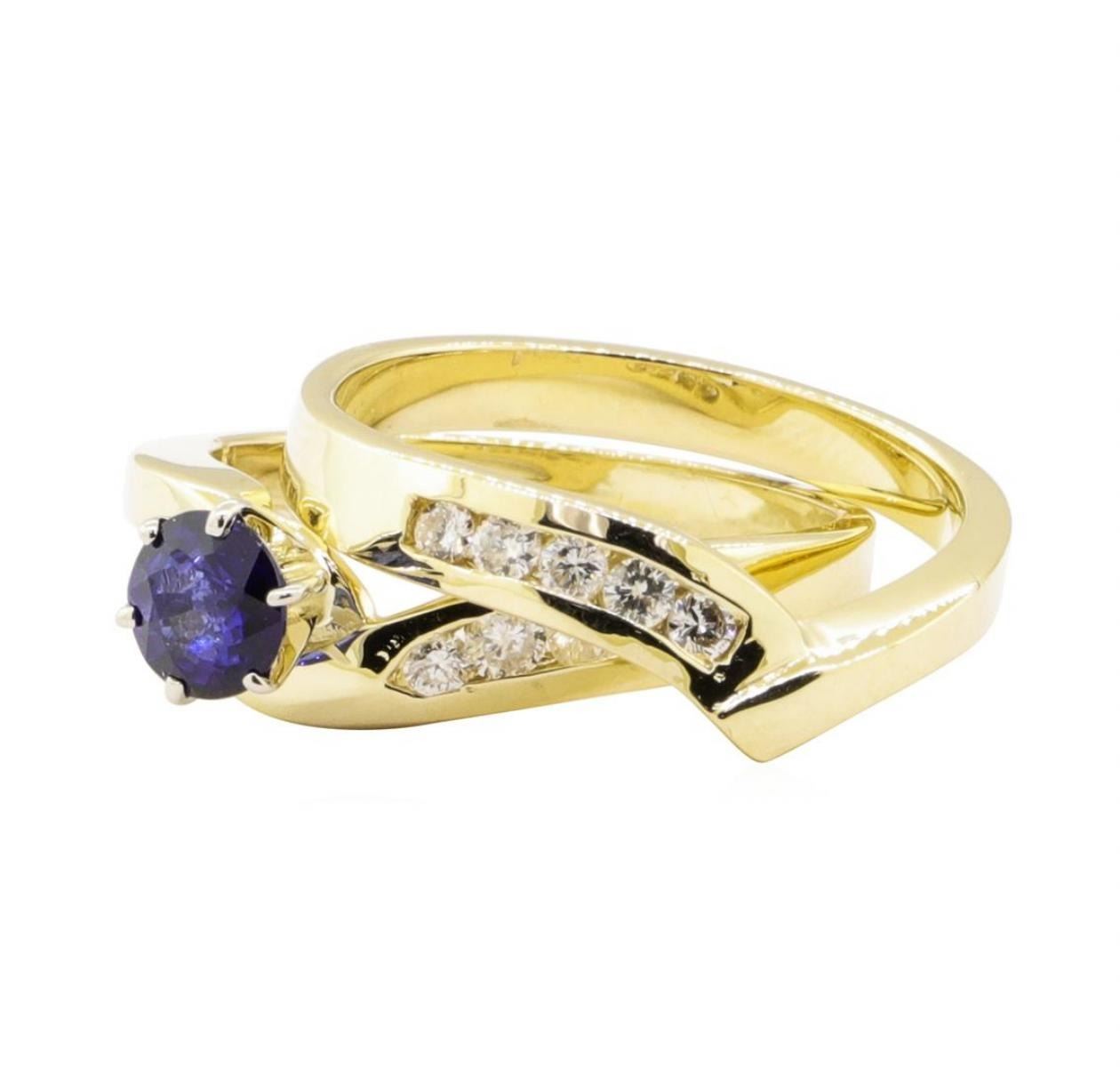 One ring set featuring: 14KT yellow gold weighing 6.0 grams containing one sapphire weighing 0.59ct and diamonds weighing 0.35ctw.