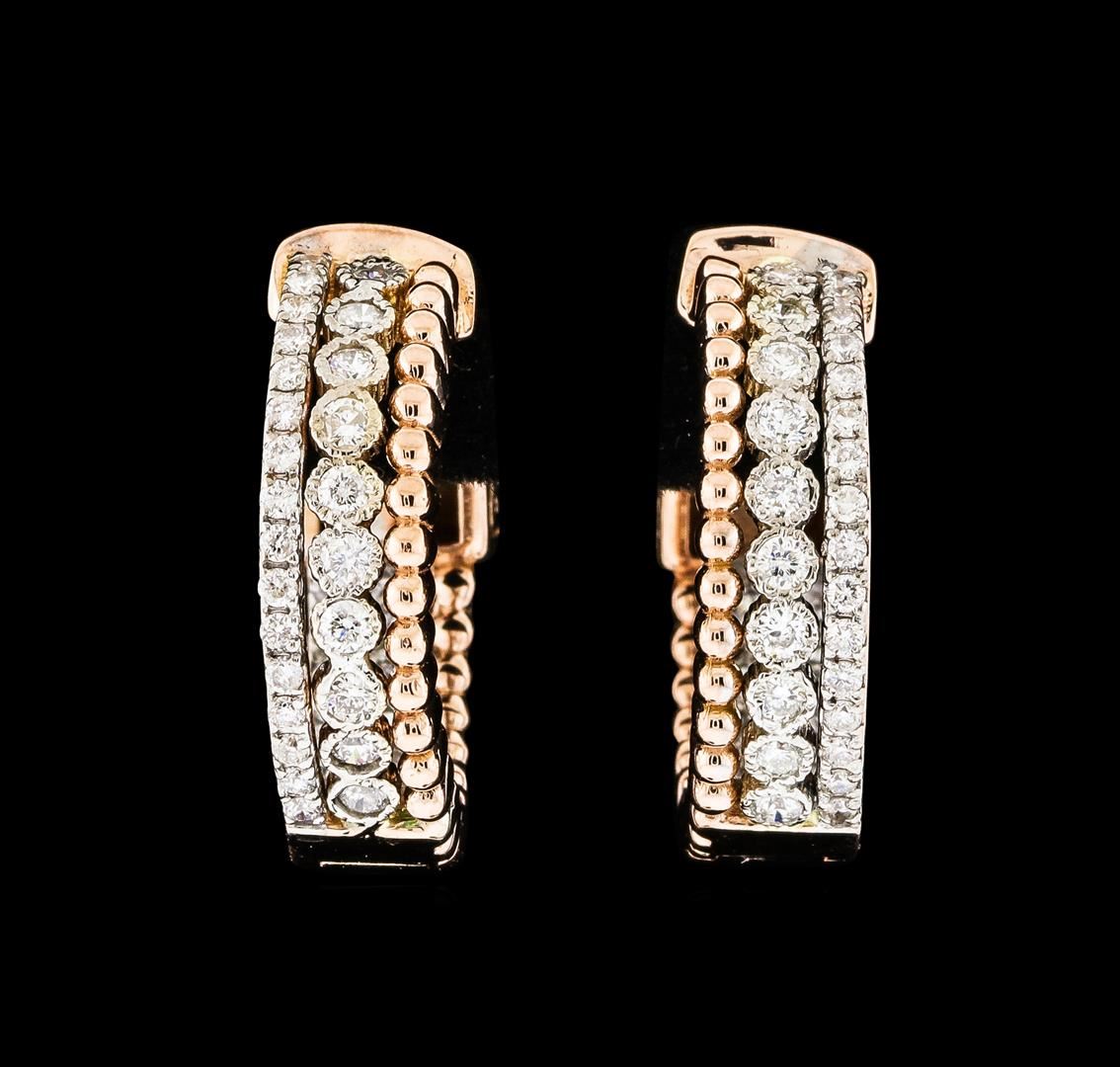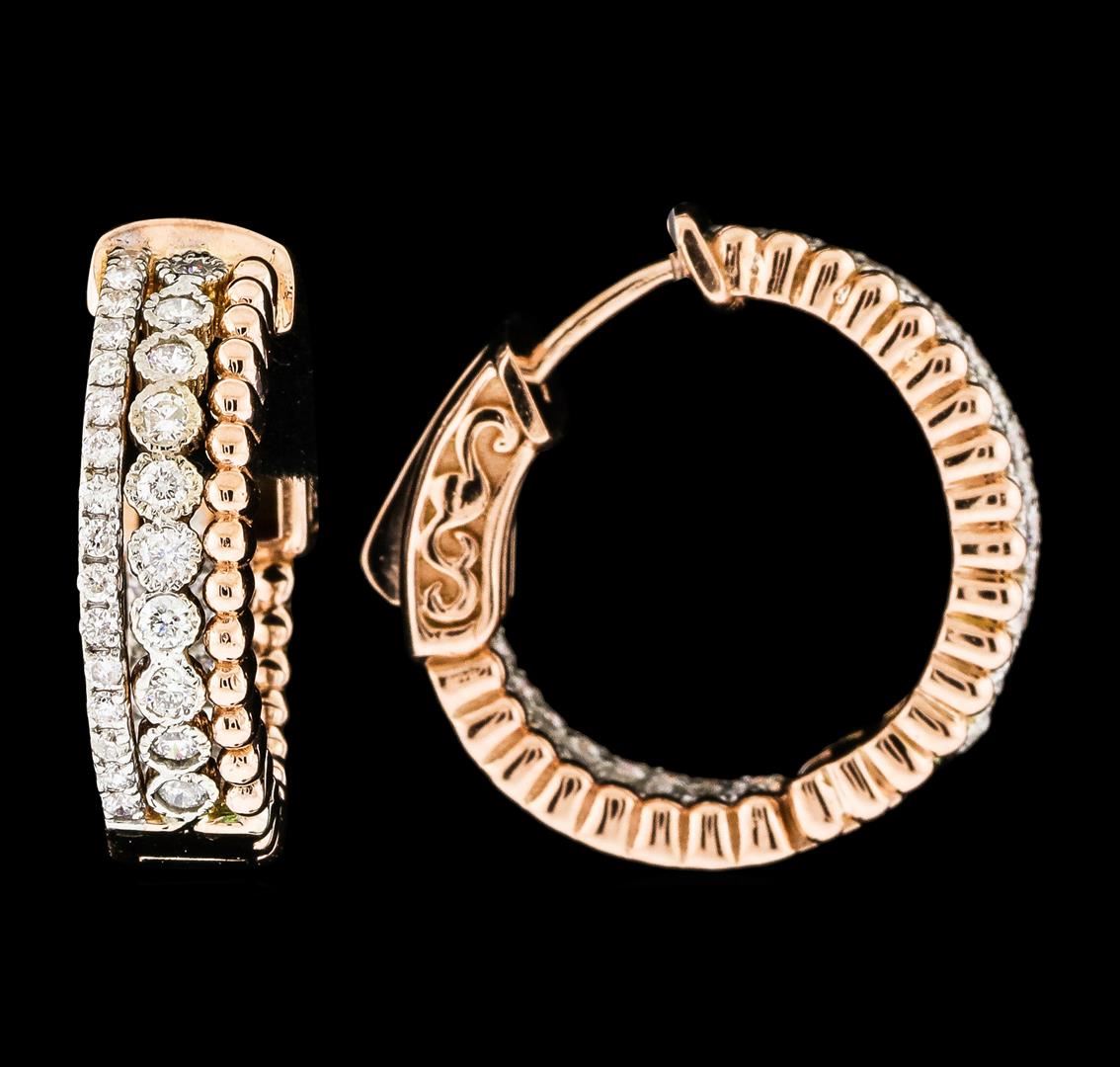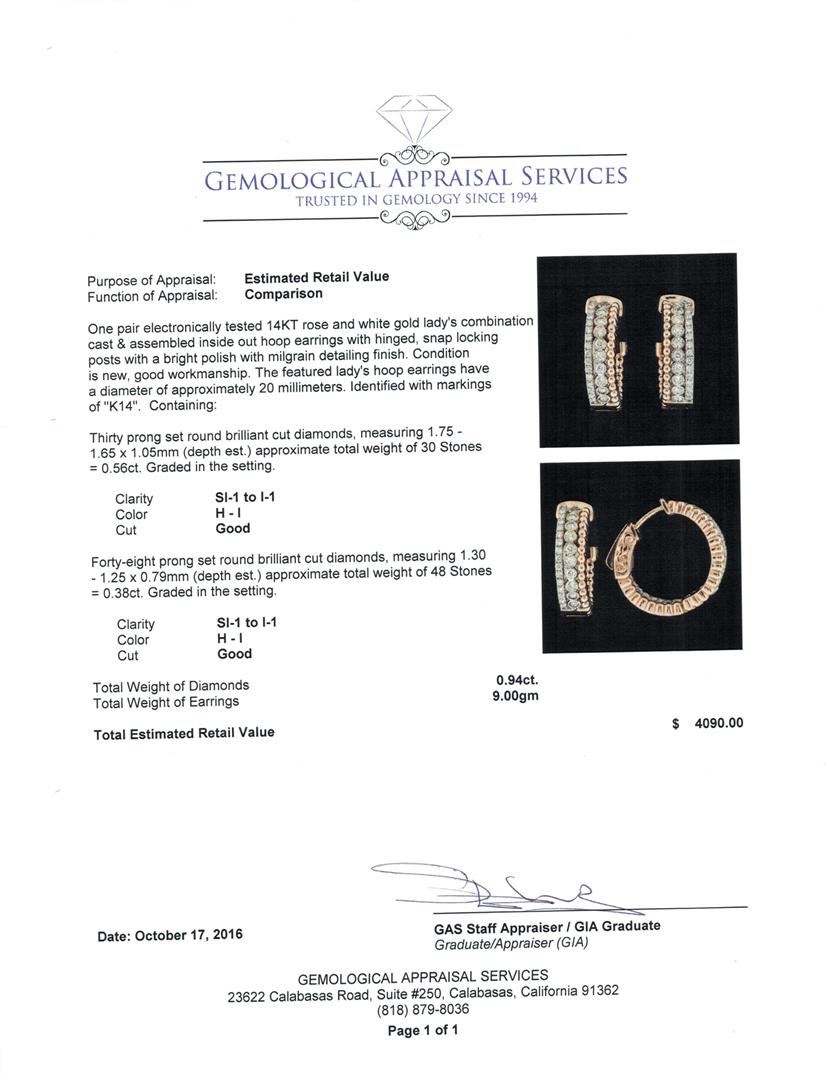One pair electronically tested 14KT rose and white gold lady's combination cast & assembled inside out hoop earrings with hinged, snap locking posts with a bright polish with milgrain detailing finish. The featured lady's hoop earrings have a diameter of approximately 20 millimeters. Identified with markings of 'K14'. Condition is new, good workmanship. Containing: Thirty prong set round brilliant cut diamonds, measuring 1.75 - 1.65 x 1.05mm (depth est.) approximate total weight of 30 Stones = 0.56ct. Graded in the setting. Clarity SI-1 to I-1. Color: H - I Cut Good Forty-Eight prong set round brilliant cut diamonds, measuring 1.30 - 1.25 x 0.79mm (depth est.) approximate total weight of 48 Stones = 0.38ct. Graded in the setting. Clarity SI-1 to I-1. Color: H - I Cut Good. Total Weight of Diamonds 0.94ct.. Total Weight of Earrings 9.00gm. GAS Appraised at $4,090.00.